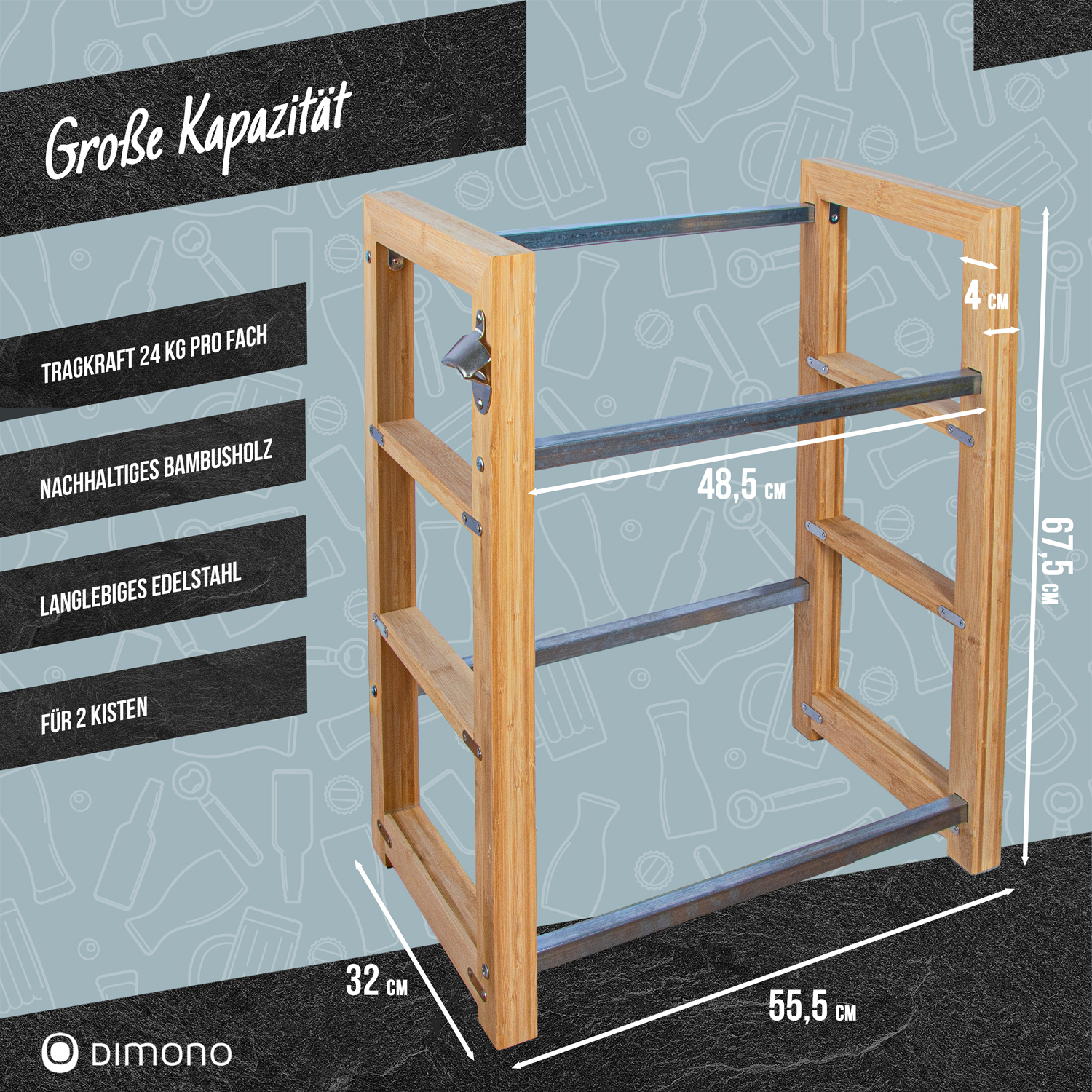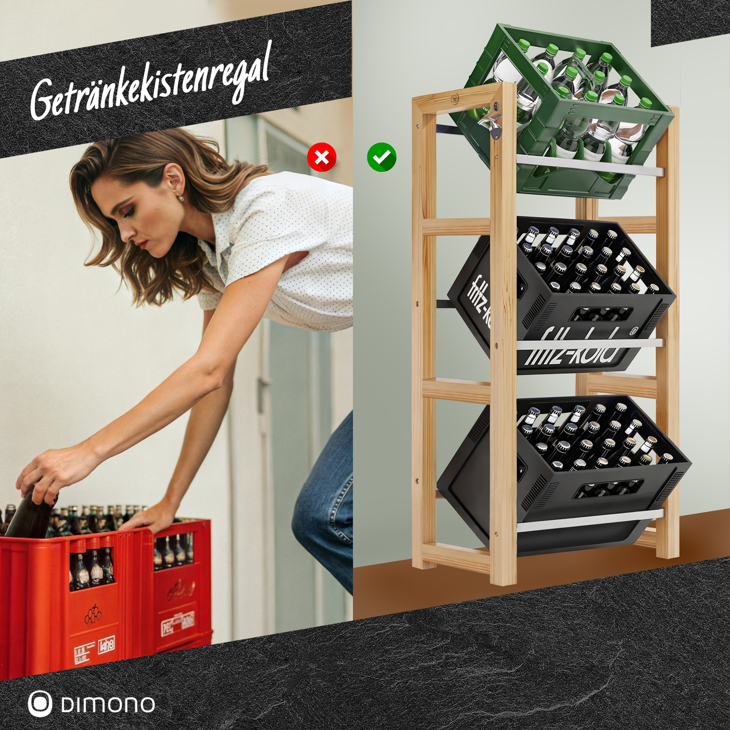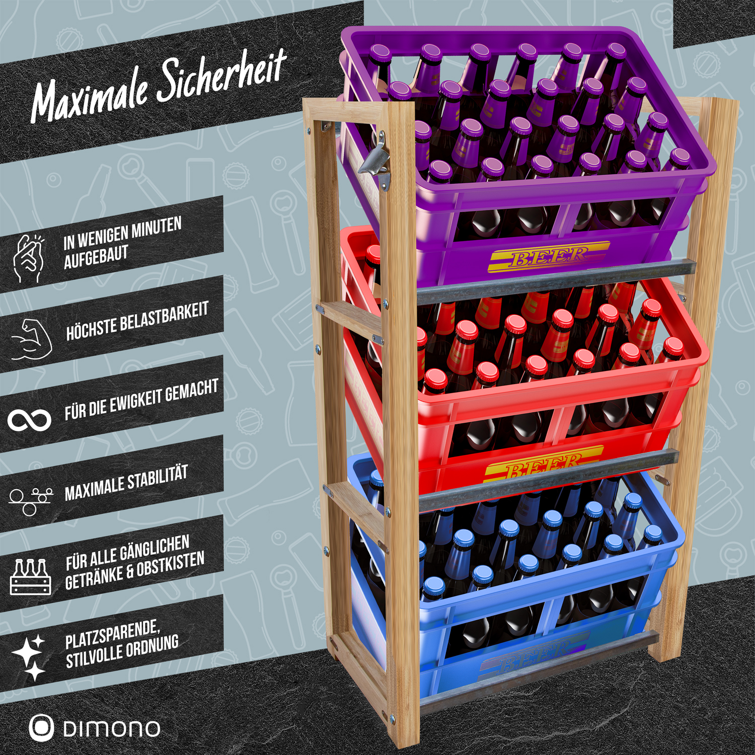 Das Dimono Getränkekistenregal bietet eine ideale Lösung zur Aufbewahrung von Getränkekisten in Ihrem Zuhause. Es ist in drei verschiedenen Varianten erhältlich: für 2, 3 oder 6 Kisten, sodass Sie je nach Bedarf die passende Größe wählen können. Ob Bier-, Wasser- oder Limonadenkisten – das Regal eignet sich für alle gängigen Formate und sorgt dafür, dass Ihre Vorräte sicher und ordentlich verstaut sind.
