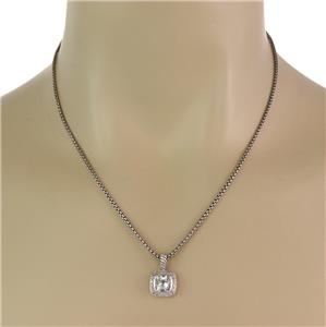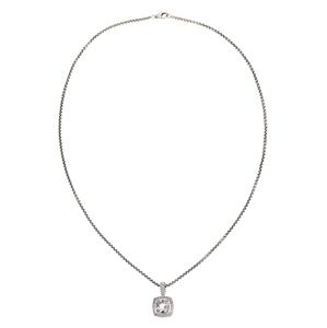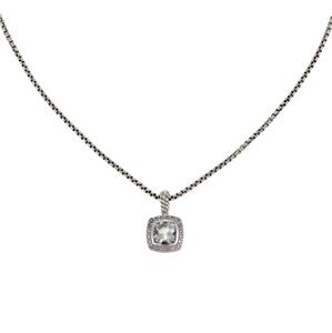 This lovely authentic necklace is by David Yurman from the Albion collection. It is crafted from sterling silver with a high polished finish. The pendant is a cushion shape with the silver cable design and a bezel set cushion shape green amethyst (prasiolite) gemstone surrounded with 25 points diamond. It is attached to a sterling silver box link chain which secures with a lobster clasp and is fully signed by the designer with the metal content.