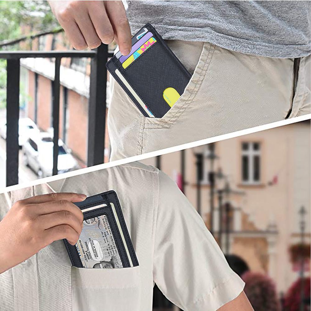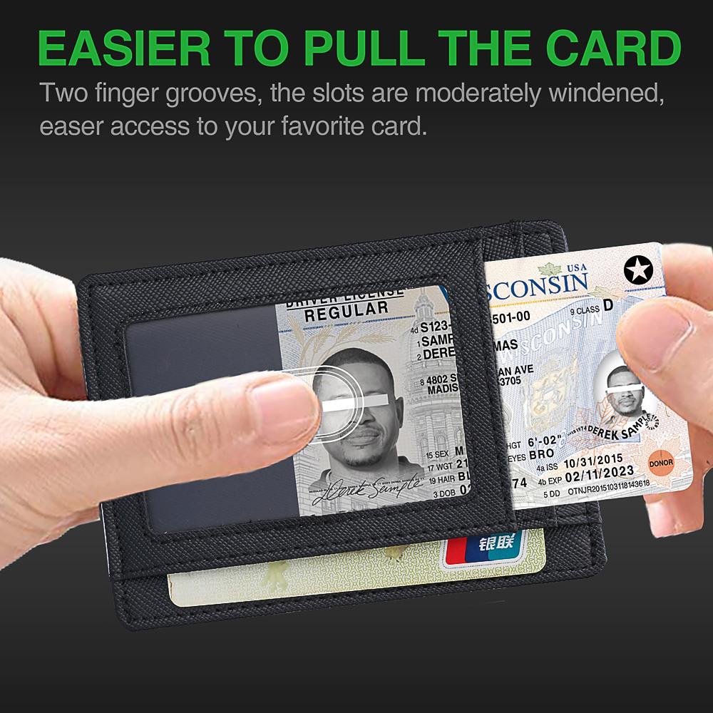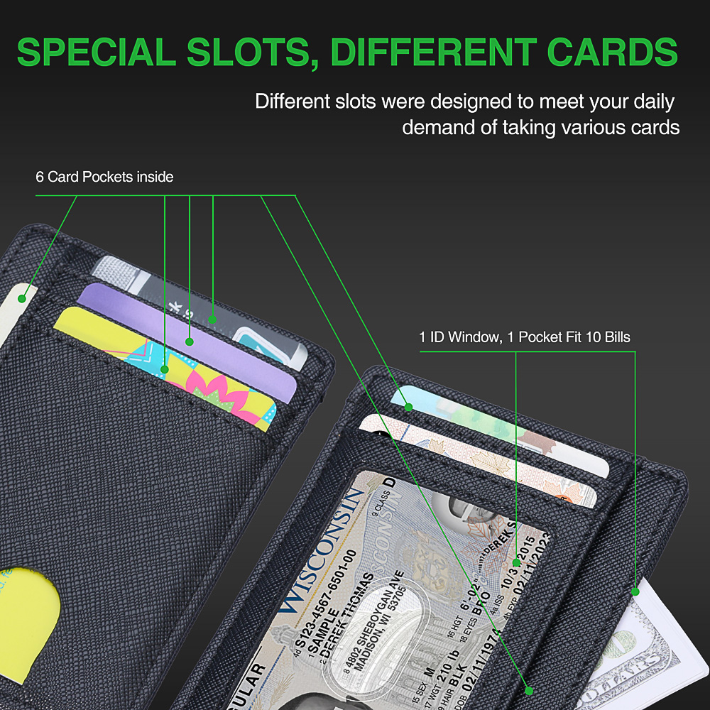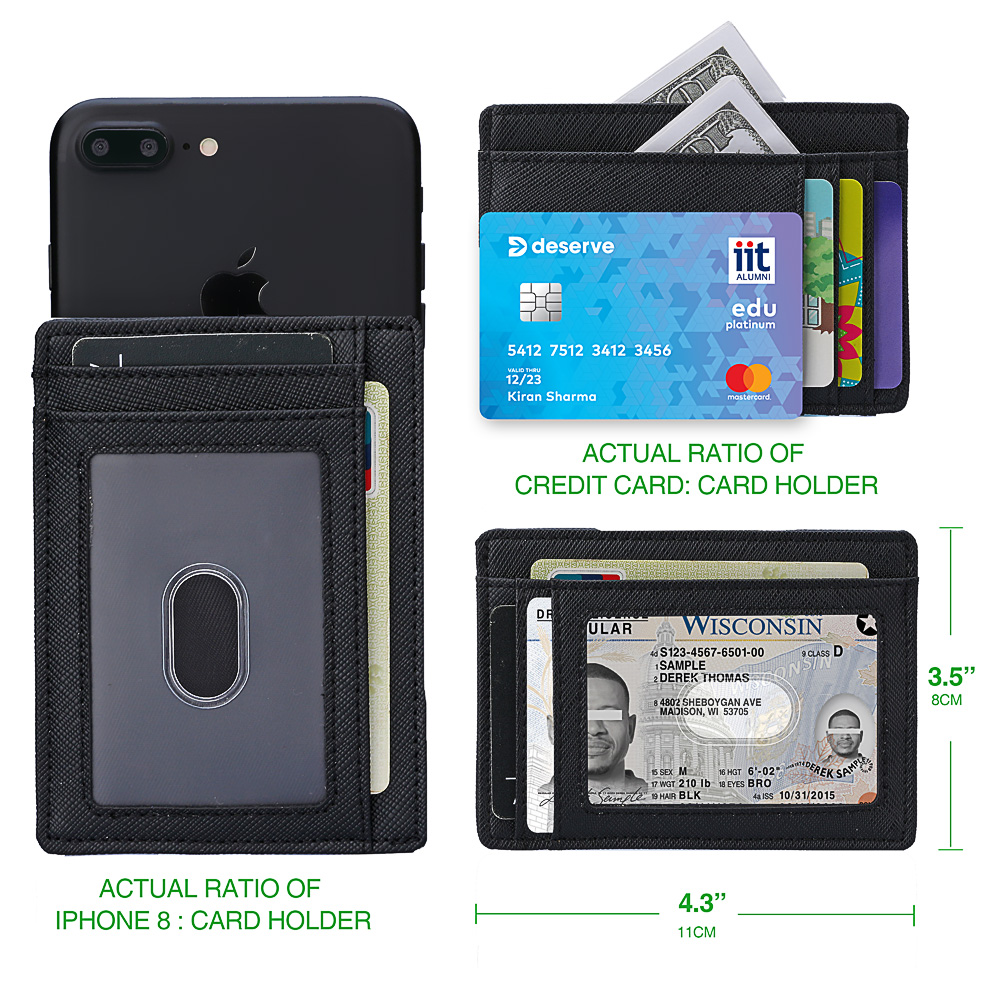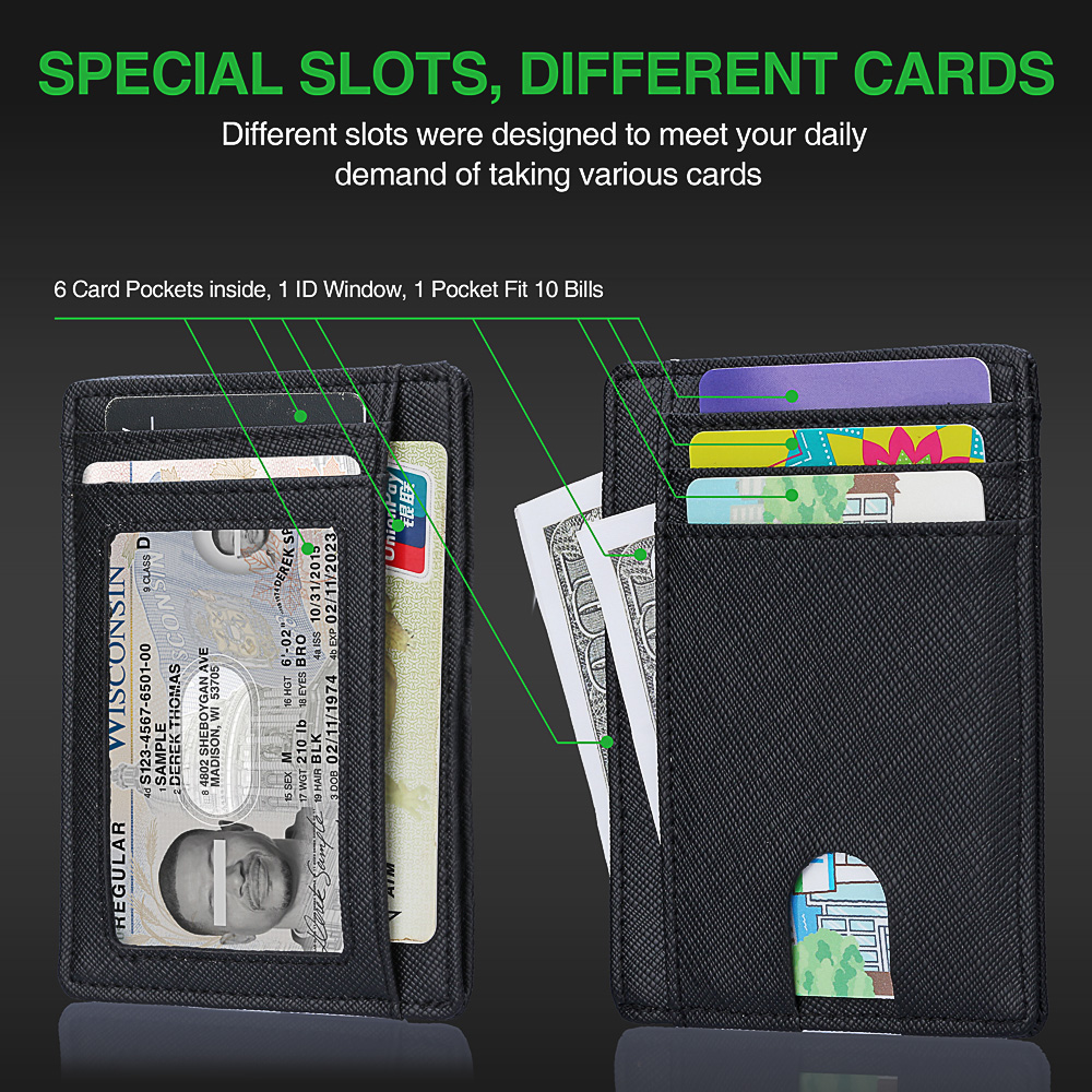 - MINIMAL & ULTRA-SLIM - Measuring just 4.4" x 3.5", come with 6 card slots, 1 ID window and 1 money or receipt pocket, make it holds a lot without bulky. Ultra Slim Design makes it easy to slide into your front pocket or back pocket.