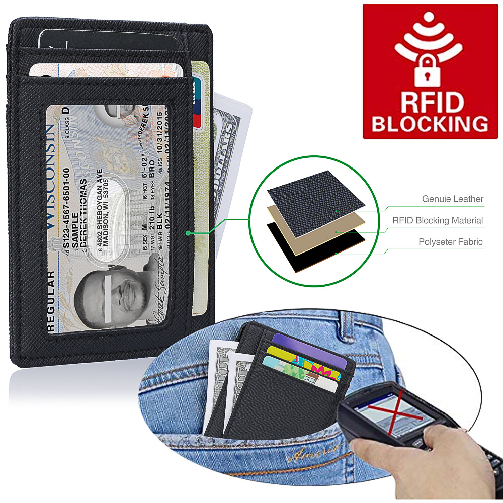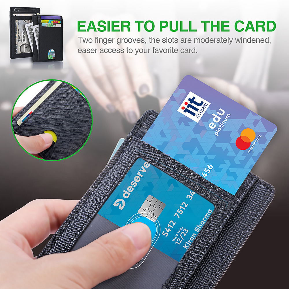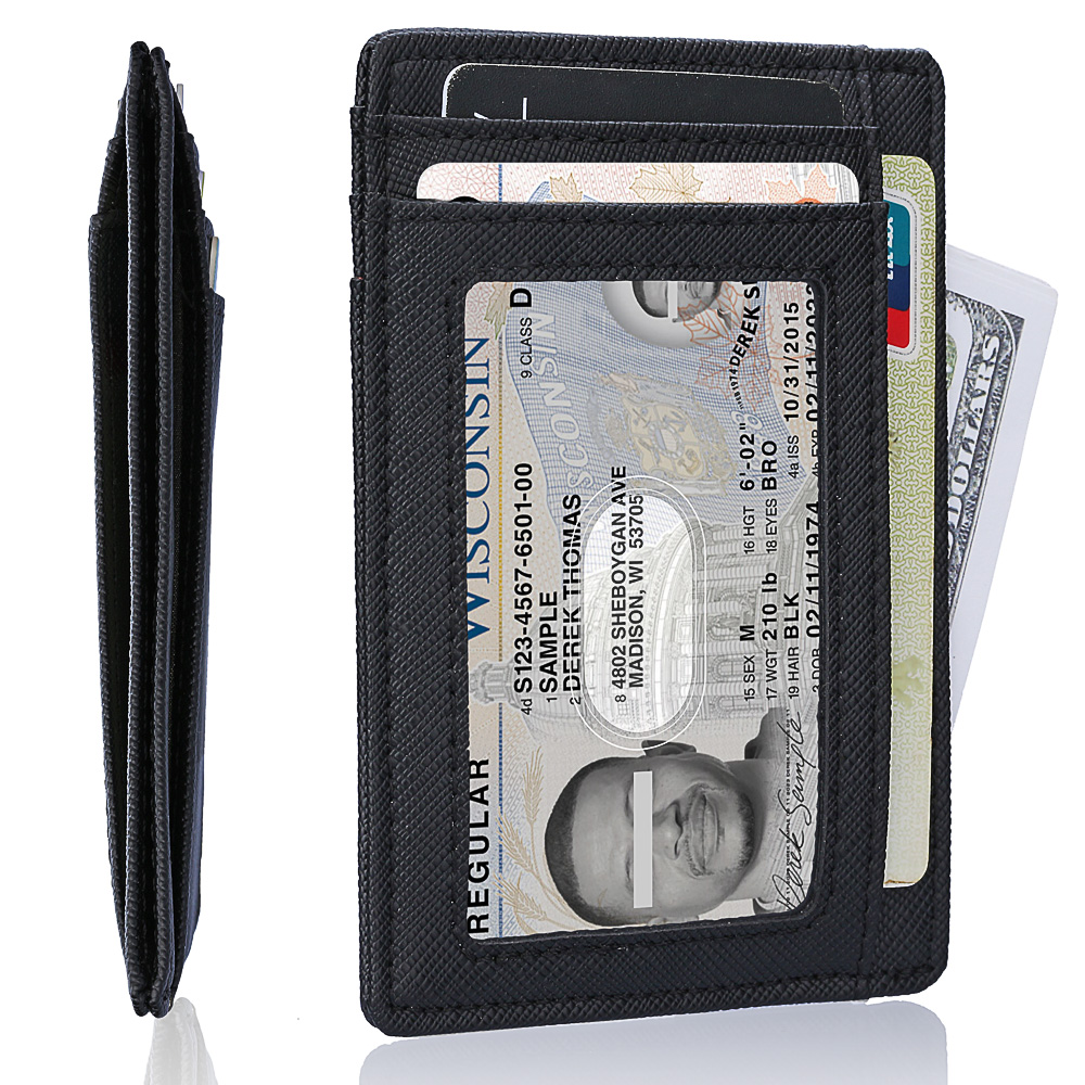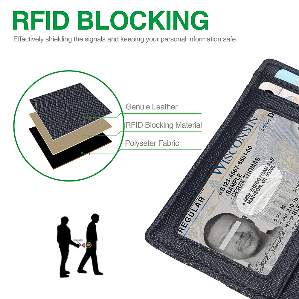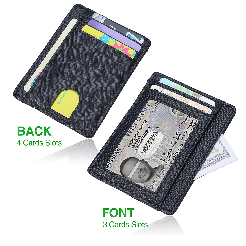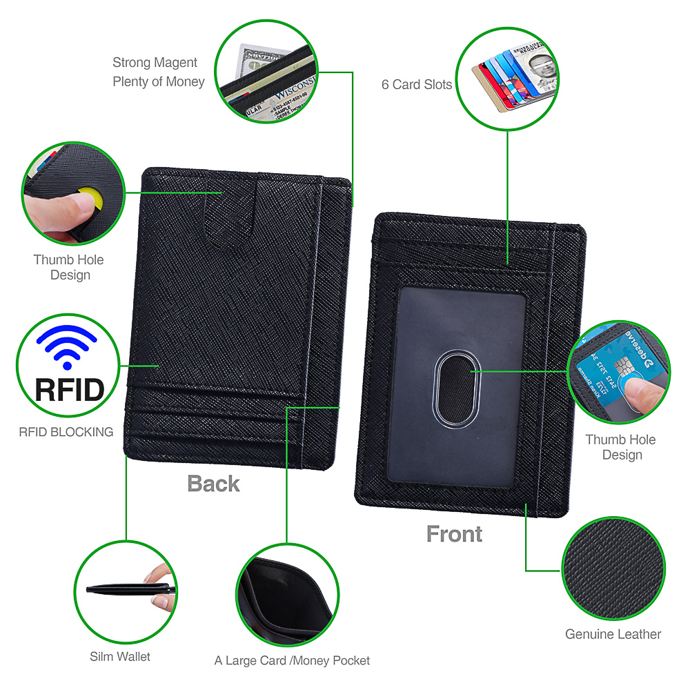 - MINIMAL & ULTRA-SLIM - Measuring just 4.4" x 3.5", come with 6 card slots, 1 ID window and 1 money or receipt pocket, make it holds a lot without bulky. Ultra Slim Design makes it easy to slide into your front pocket or back pocket.