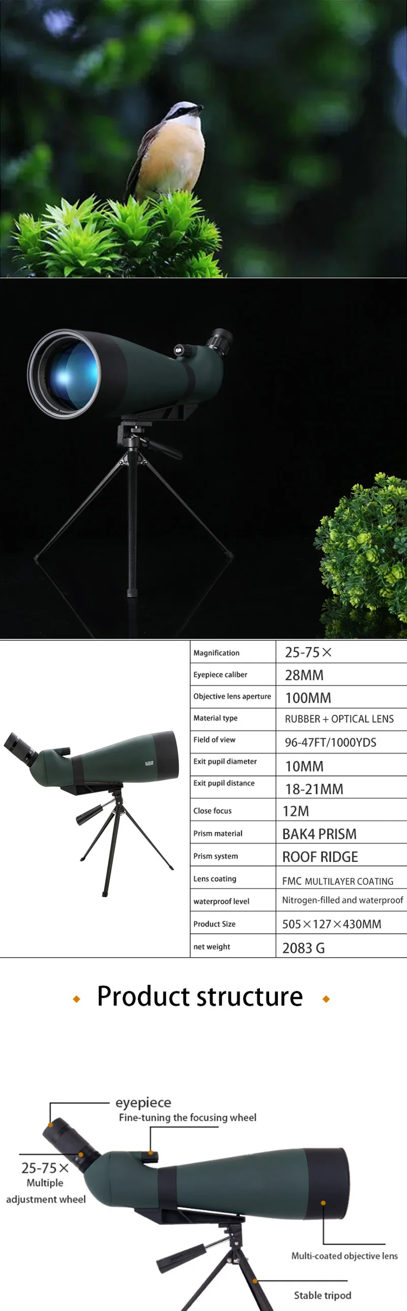 Skyoptikst birdwatching telescope zoom 25-75x100 high power HD target astronomical