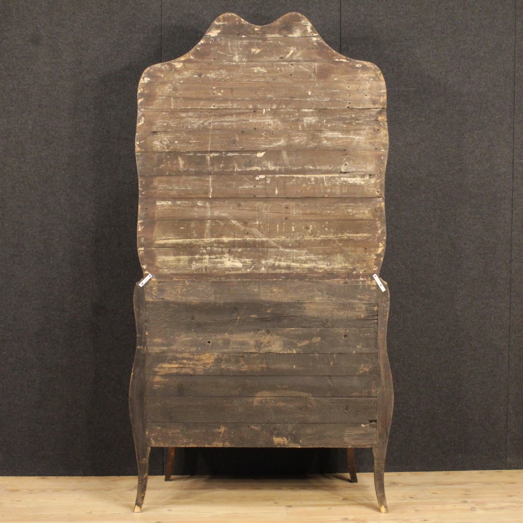 Élégant scriban génois de la première moitié du 20ème siècle. Meuble double corps de haute qualité incrusté en bois de violette, bois de rose et ronce. Corps inférieur à bureau de pente avec trois tiroirs externes de bonnes capacités. A l'intérieur du bureau il y a cinq tiroirs, différentes ouvertures et un bureau de service. Le corps supérieur a deux portes avec miroirs et deux petits étages porte-bougie amovible. Meuble idéal pour être inclus dans une exposition ou salle d'étude. Scriban dans le complexe en bon état de conservation, il a quelques signes d'usure et de petits manques. H 226 x L 120 x P 58 cm