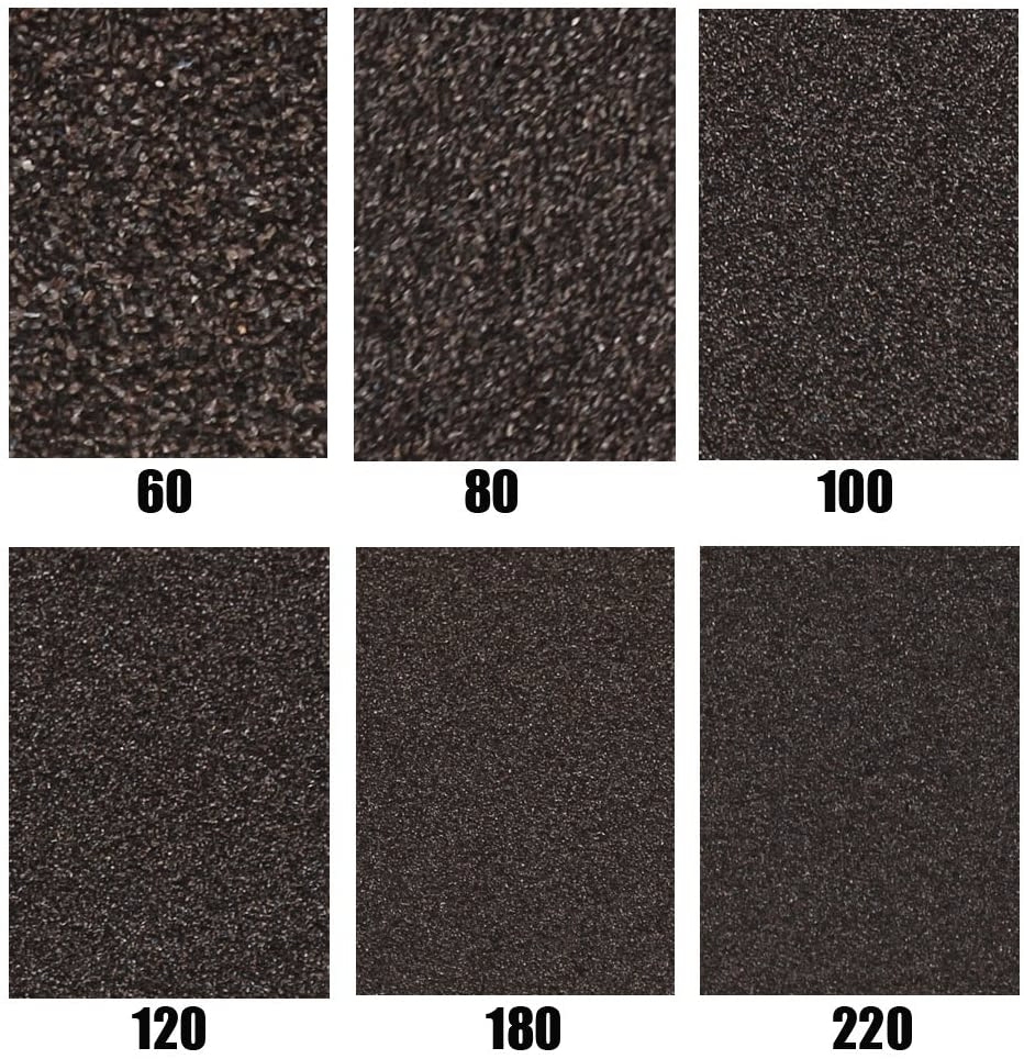 Grit and Grade: 60 Coarse / 80 Medium / 100 Medium / 120 Fine / 180 Fine / 220 Extra Fine