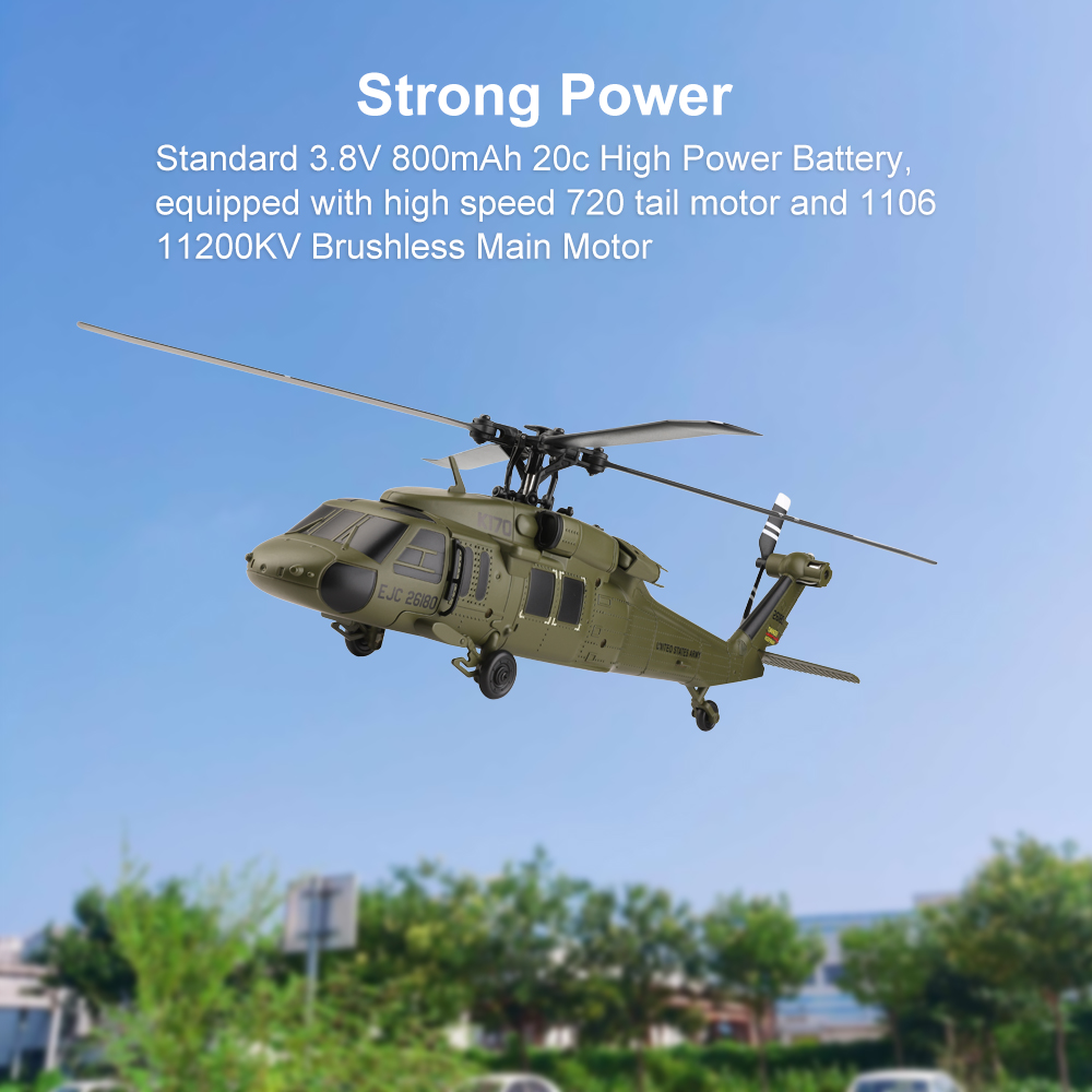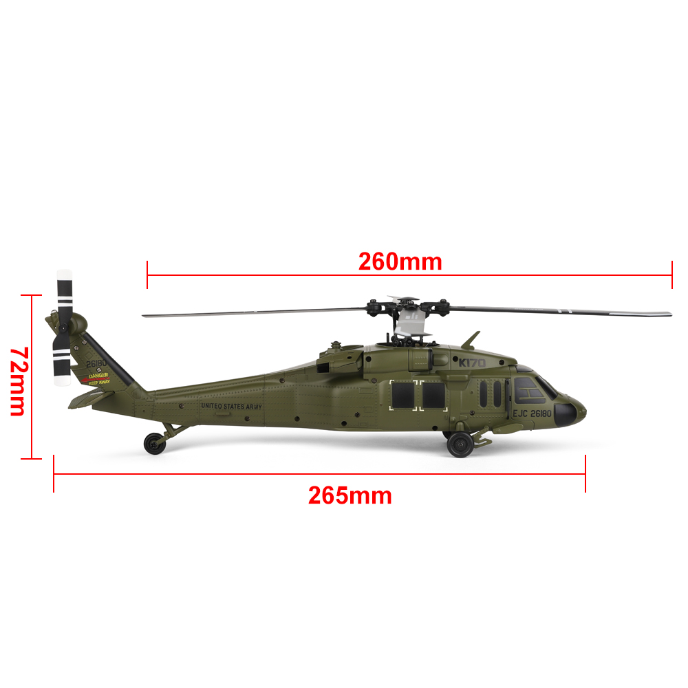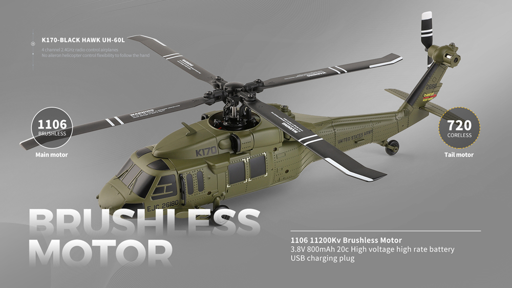 Wltoys K170 Black Hawk UH-60L RC Helicopter,It features a no-aileron design with dual-axis coaxial drive motors for precise control.Utilizes 1106 outrunner brushless motors with strong power, Standard configuration 3.8V 800mAh 20c high-power battery, Equipped with efficient military 2G digital servo, it has fast response, high precision, and precise return to the center, making it particularly suitable for beginners to fly.