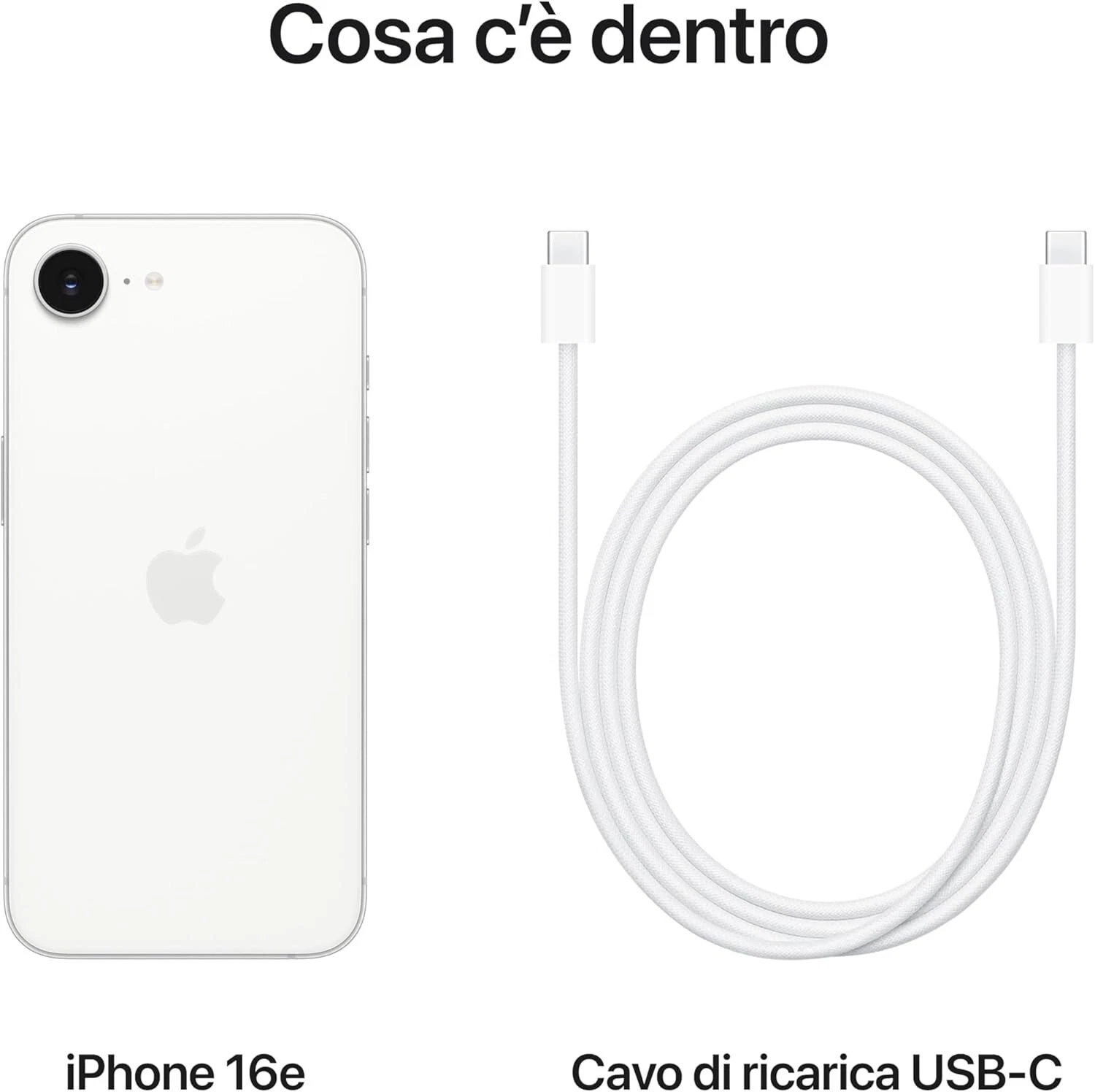 iPhone 16e è progettato per Apple Intelligence e ha tutta la potenza del chip A18.1 Scatta foto ad altissima risoluzione con la fotocamera Fusion da 48MP. Manda messaggi, naviga online e fai tutto quel che ti piace, ancora più a lungo: l’autonomia è grandiosa. Fa di tutto per te, tenendo tutto per sé. Scrivere, creare e far tutto ciò che vuoi ora è più facile che mai. Il chip A18 rende possibili Apple Intelligence e gaming di alto livello. E con gli aggiornamenti periodici di iOS, il tuo iPhone resta come nuovo, per anni. Manda messaggi, naviga online, goditi film e serie TV: la batteria ti offre fino a 26 ore di riproduzione video.2 È la migliore autonomia di sempre per un iPhone da 6,1"". Il sistema con fotocamera due in uno riunisce una Fusion da 48MP per foto ad altissima risoluzione e un teleobiettivo 2x di qualità ottica. E la fotocamera frontale da 12MP scatta fantastici selfie. Lo spettacolare display da 6,1"" usa la tecnologia OLED. E la parte frontale è in Ceramic Shield, più forte di qualsiasi vetro per smartphone. Personalizzalo per accedere al volo alle tue app e funzioni preferite, o per avere informazioni su ciò che ti circonda usando l’intelligenza visiva. Con iOS 18, puoi personalizzare la schermata Home e la schermata di blocco, inviare messaggi con effetti di testo, rispondere al volo usando le emoji e molto altro. Se non c’è campo o non ci sono reti Wi-Fi disponibili, iPhone può contattare i soccorsi via satellite. Usa il Face ID per sbloccare l’iPhone, accedere alle app e pagare i tuoi acquisti in tutta sicurezza.