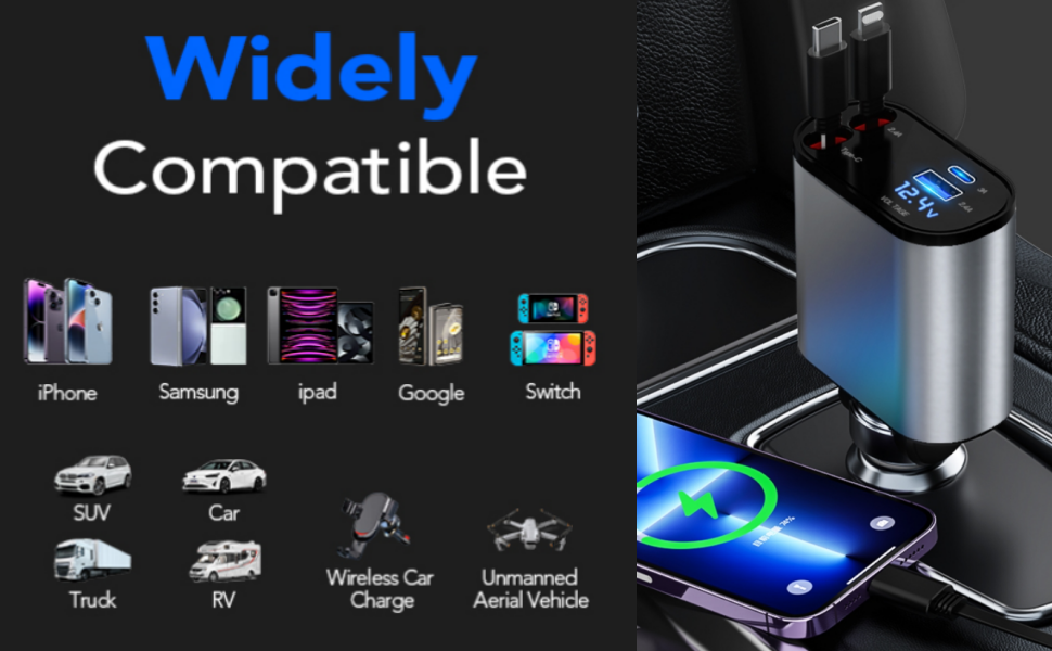 Features: Efficient Fast Charging: This 2-port multifunctional car charger with retractable cables delivers rapid charging for your devices on the go. Stable Power Supply: Equipped with a stable charging cigarette lighter usb adapter, this charger ensures a reliable power source for your devices. Fast and Safe Charging: This charger provides fast and safe charging for your devices, making it an ideal gift for friends, family, and neighbors. Wide Compatibility: Compatible with most smartphones, this charger is designed to meet the needs of various device users. Smart Charging Technology: With smart features that adapt to different devices, this charger delivers optimal charging performance for all your gadgets.