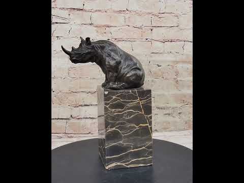 The bronze sculpture is finished with a special hand-painted multi-gold and brown color patina, giving it a unique and stunning appearance. Mounted on a beautiful brown marble base, this sculpture is both sturdy and elegant. Signed by the talented artist, Milo, this sculpture is sure to become a treasured addition to any collection. Don't miss your chance to own this incredible piece of art and bring the power of the rhinoceros into your home or office today. With its lifelike qualities, intricate details, and stunning finish, this bronze sculpture is a true work of art that captures the essence of the rhinoceros and adds a touch of natural beauty to any space.