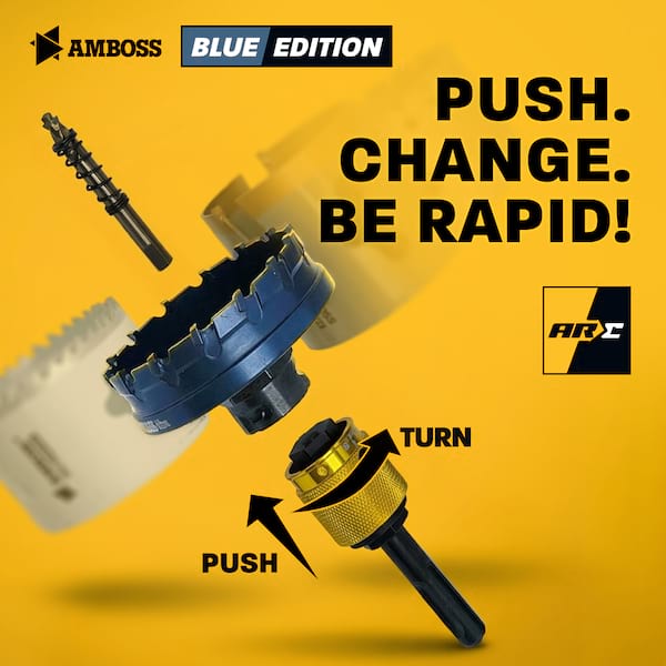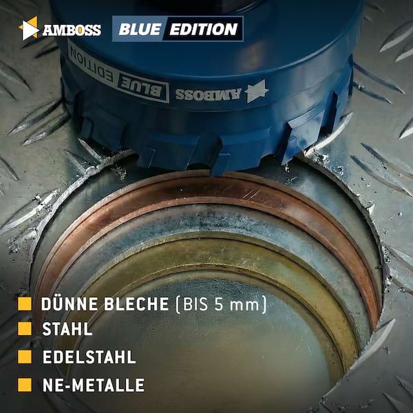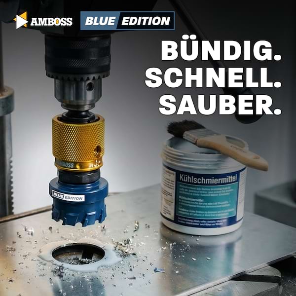 Die Amboss Flachschnitt Lochsäge BLUE EDITION setzt neue Maßstäbe bei präzisen Bohrungen in Stahlblechen, Edelstahl, NE-Metallen, Alu Dibond, Trespa, HPL und Kunststoffen. Mit ihrer revolutionären HM Carbide Technology erreicht sie eine 10× längere Standzeit gegenüber konventionellen Bi-Metall-Lochsägen – perfekt für intensive Einsätze im Schaltschrankbau, Elektroinstallationen und präzise Rohrdurchgänge. Die spezielle Zahngeometrie mit optimiertem HM-Zahnan schliff schneidet sauber bis zu 5 mm Schnitttiefe (maximal 15 mm) und liefert ausrissfreie, glatte Lochränder. Der Führungsbohrer mit Stufenspitze garantiert punktgenaues Ansetzen ohne Wegrutschen – selbst bei dünnsten Blechen oder empfindlichen Oberflächen. Exklusiv für das Amboss ARC Schnellwechselsystem ausgestattet, bietet die BLUE EDITION blitzschnellen Werkzeugwechsel und verlustfreie Kraftübertragung. Das System ist ideal für Profis, die höchste Präzision und Effizienz in einem verlangen – ohne lange Rüstzeiten oder komplizierte Montage. Ob Schaltschrankbau, Steckdoseninstallationen, Kabeldurchführungen oder dekorative Blecharbeiten – die Amboss Flachschnitt Lochsäge BLUE EDITION kombiniert Langlebigkeit, Schnelligkeit und höchste Fertigungsqualität für perfekte Ergebnisse bei jeder Anwendung.