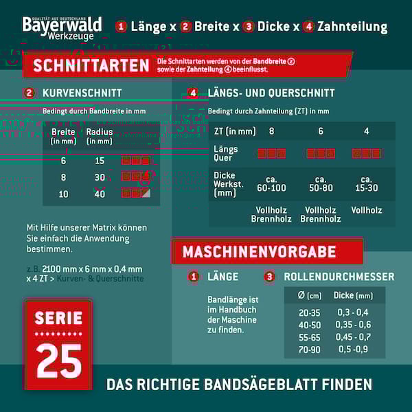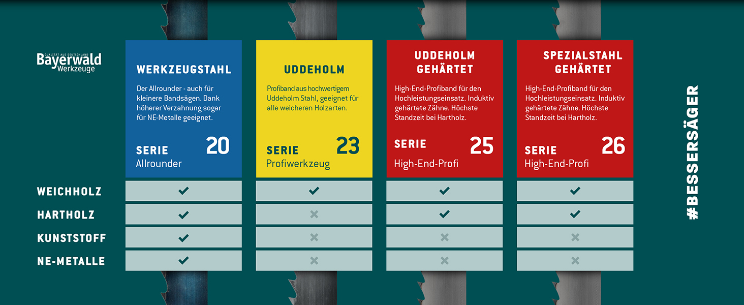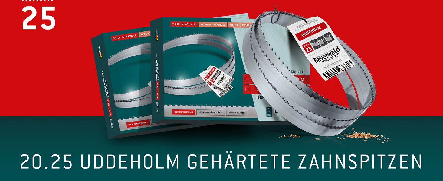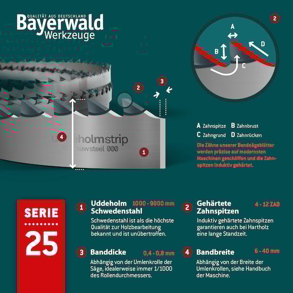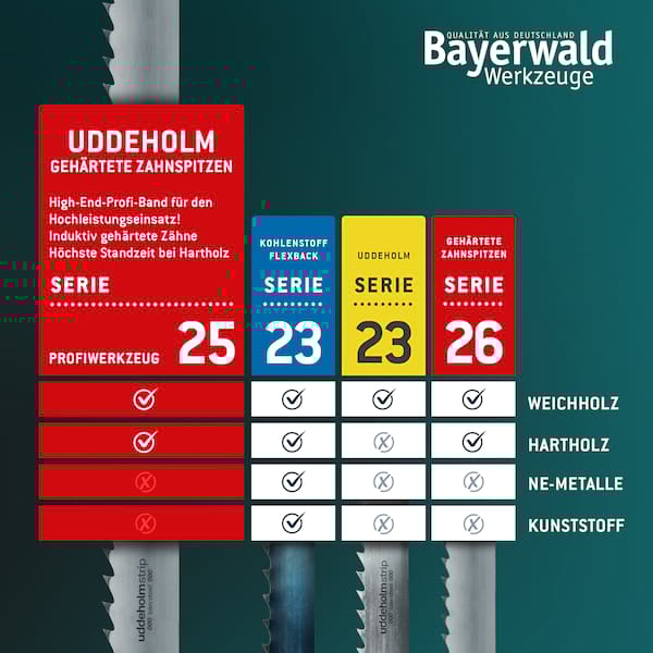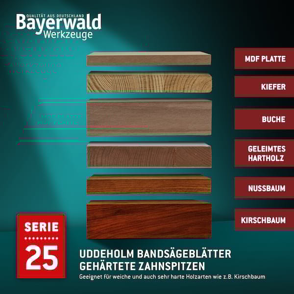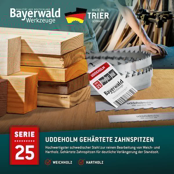 • Sägebänder aus Uddeholm-Stahl - hochwertigster Stahl in Deutschland geschweißt. Das richtige Sägeband für das Sägen von harten Hölzern im High-End Profi-Bereich dank speziell gehärteter Zahnspitzen.