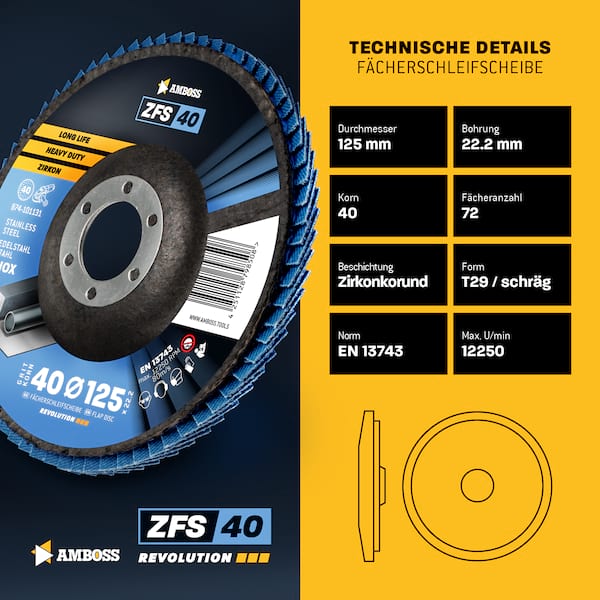 • 10x Amboss Werkzeuge ZFS Fächerschleifscheibe Ø 125 mm / Bohrung 22,2 mm / Korn 40 Die Lamellenscheibe aus der Serie Revolution von Amboss mit hochwertigem Zirkonkorund bietet längste Standzeit bei der Bearbeitung von Stahl (Schwarzstahl / Baustahl, STt37, S235JR, 1.0037 bzw. Karbonstahl), Stahlguss, Edelstahl (VA-Stahl, Inox), Gusseisen und Stahlblech. Bis zum vollständigen Verbrauch des Schleifkorns erhältst du dabei ein gleichmäßiges Schleifbild!