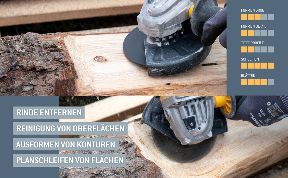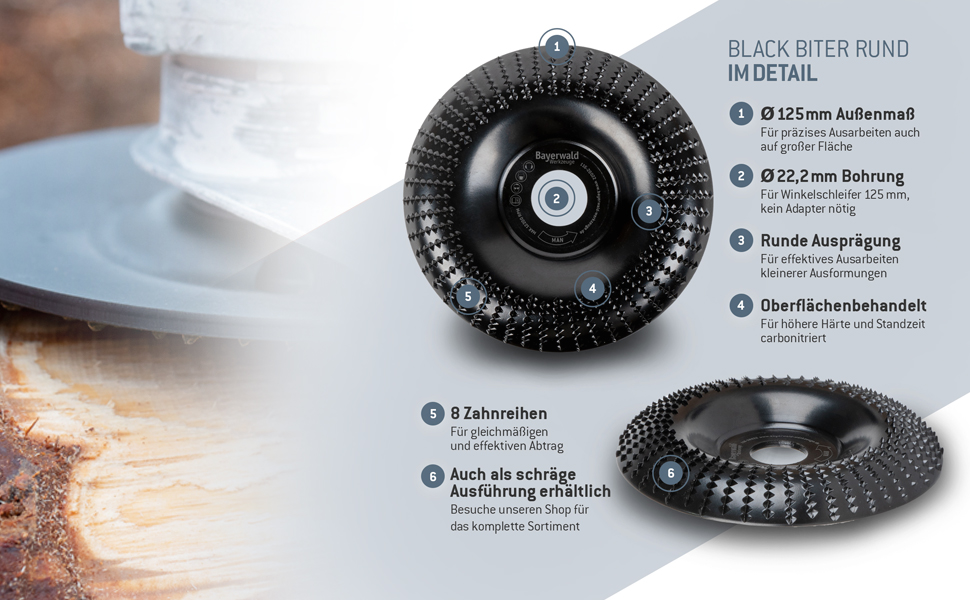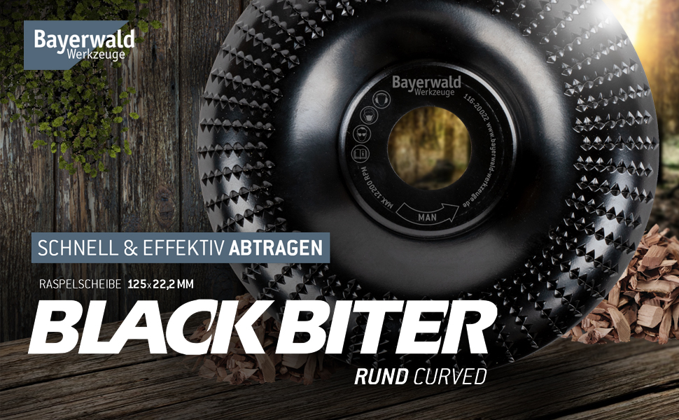 " Der Black Biter in der runden Variante ist optimal für das Ausformen geeignet. Seine Zähne ermöglichen das effektive Ausarbeiten von kleineren Ausformungen mit höchster Präzision. Beispielsweise die Herstellung von Holzschalen fällt so viel leichter – der Black Biter ist Ihr Werkzeug erster Wahl für diese Aufgabe.   Die zwei verfügbaren Durchmesser entsprechenden den gängigsten Größen von Winkelschleifern. Zusätzlich verfügen alle Raspelscheiben von Bayerwald über eine 22,2 mm Bohrung, sie können mit handelsüblichen Winkelschleifern ohne zusätzliche Adapter oder ähnliches verwendet werden.   Die Raspelscheibe ist bestens geeignet für Arbeiten wie: * Ausformen von Konturen * Präzises Aushöhlen   "