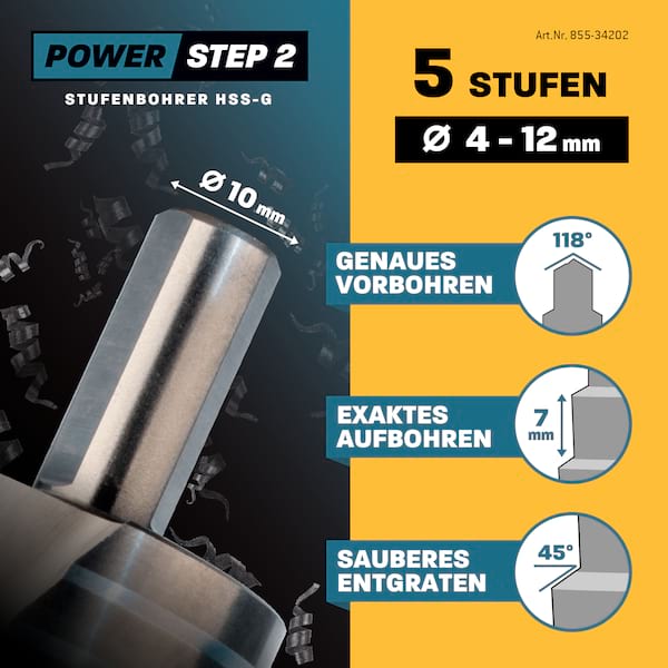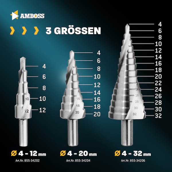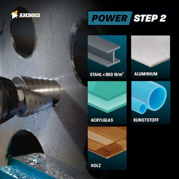 Mit diesem hochwertigen Konusbohrer meisterst du unterschiedlichste Materialien wie legierte Stähle bis 800 N/mm², Baustahl, Bleche, Buntmetalle, Holz und Kunststoffe – und das alles ohne lästigen Werkzeugwechsel. Die fünf klar definierten Stufen (4–20 mm) ermöglichen dir schnelles und komfortables Aufweiten von Löchern in nur einem Arbeitsgang. Besonders clever sind die zwei spiralförmigen Nuten, die für eine optimale Spanabfuhr und einen ruhigen, vibrationsarmen Lauf sorgen. So erzielst du saubere, präzise Bohrungen ohne lästiges Hängenbleiben, selbst bei dünnen Blechen oder empfindlichen Materialien. Der dreiseitig geschliffene, stabile 10 mm Schaft garantiert dir maximale Sicherheit beim Bohren – auch bei hohen Belastungen sitzt der Bohrer sicher im Bohrfutter und verhindert ein Abrutschen. Egal ob Handbohrmaschine oder Standbohrmaschine: Du profitierst von festem Halt und exakter Kraftübertragung. Gefertigt aus hochwertigem HSS (Hochleistungsschnellstahl), überzeugt der Amboss PowerStep 2 durch eine exzellente Standzeit und dauerhaft scharfe Schneiden. Damit ist er nicht nur für ambitionierte Heimwerker ideal, sondern auch für den harten Einsatz auf der Baustelle oder in der Werkstatt. Ob du Kabeldurchführungen installierst, Bleche bearbeitest oder bestehende Bohrungen erweiterst – dieser vielseitige Stufenbohrer ist dein zuverlässiger Partner für professionelle Ergebnisse. Dank der cleveren Abstufung und der PowerStep-Technologie sparst du wertvolle Zeit und kannst dich auf gleichbleibend hohe Qualität verlassen. Überzeuge dich selbst von der Profi-Qualität des Amboss PowerStep 2 und mach deine Projekte effizienter und sauberer als je zuvor! Jetzt bestellen und deine Bohrarbeiten mühelos meistern!