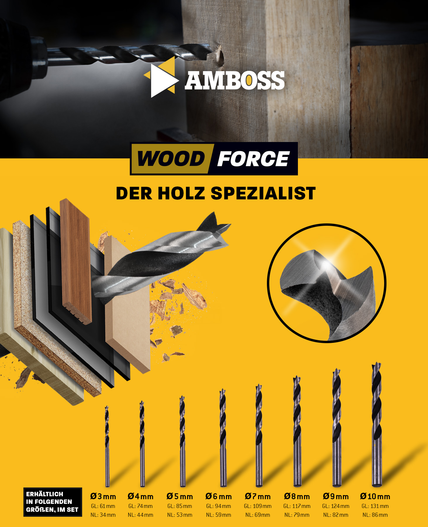 AMBOSS Holzbohrer mit geschliffener Spitze und Schulterschneiden sind ideal für alle Holzwerkstoffe sowie Kunststoffe. Die Herstellung aus hochwertigem Kohlenstoffstahl garantiert eine lange Standzeit sowie schnelle und präzise Bohrungen. AMBOSS – die Marke für den Bau, auf die Sie sich verlassen können!
