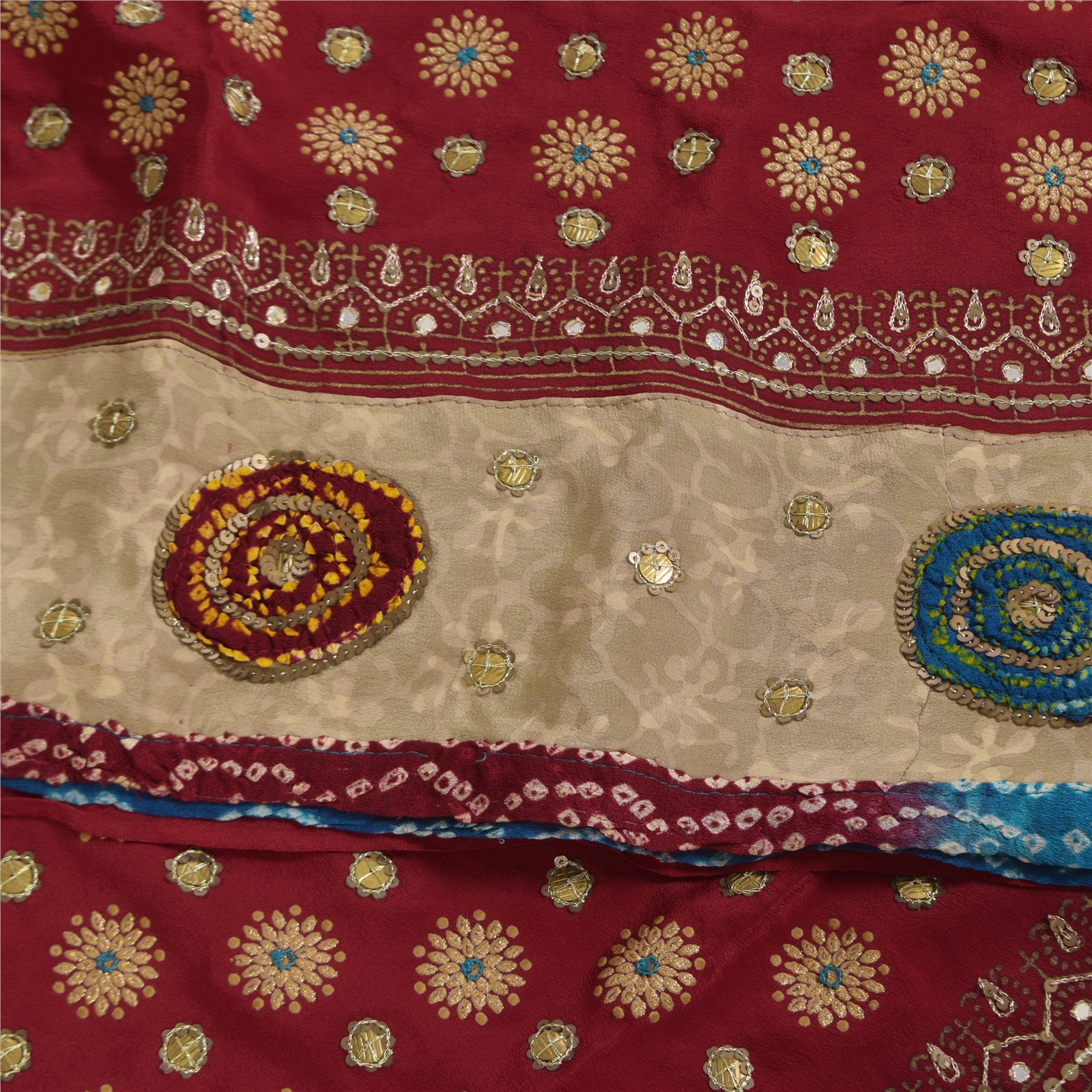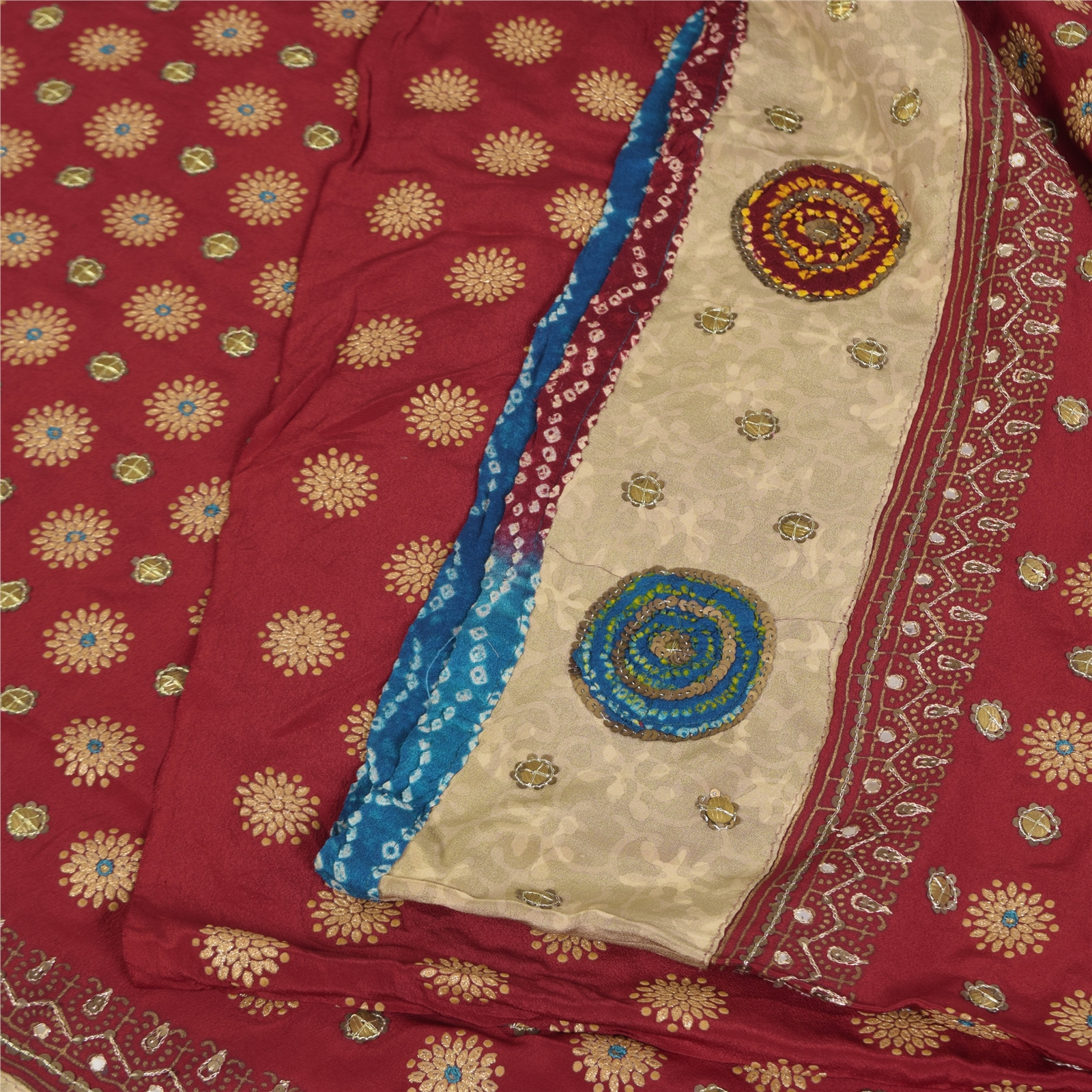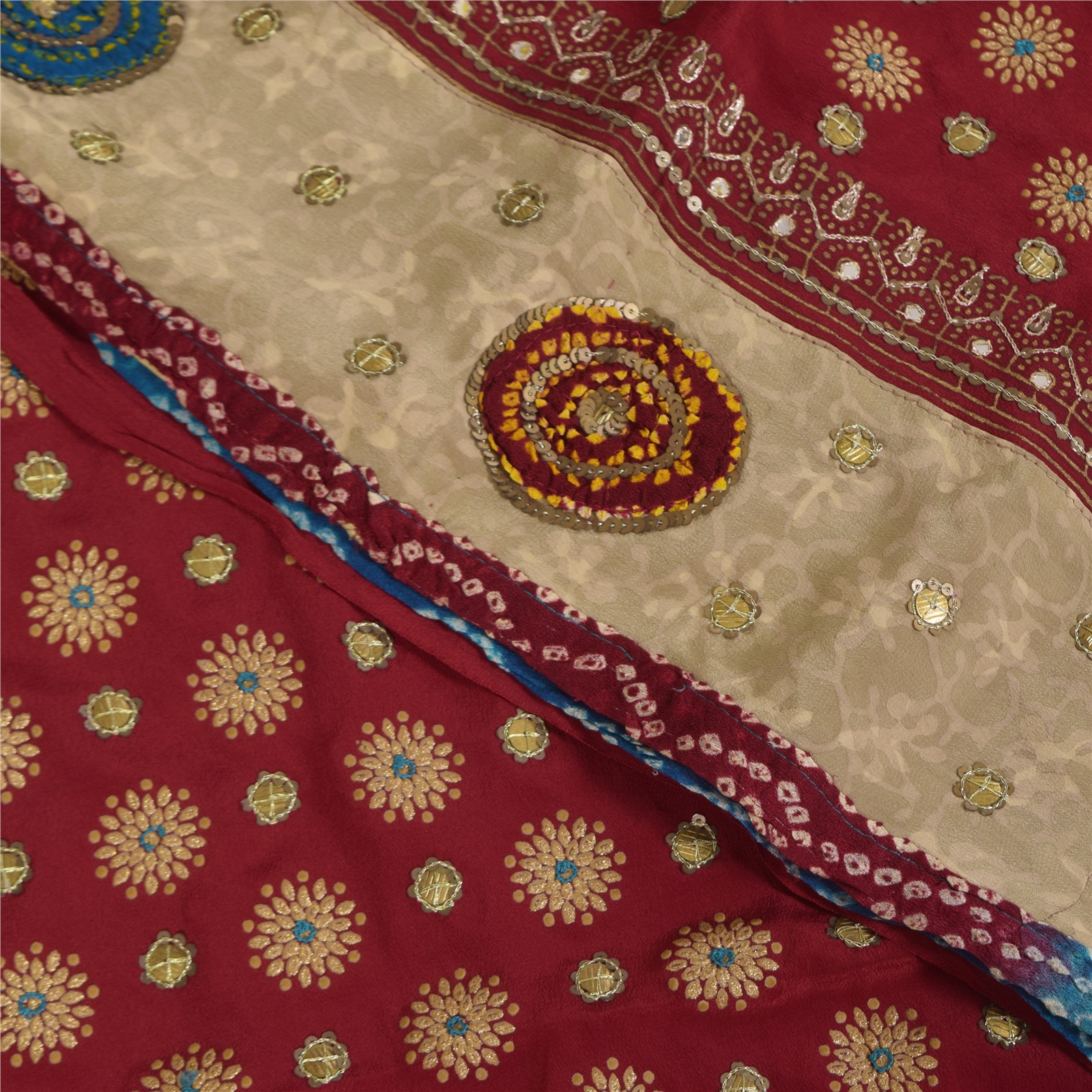 • Border Has Floral Design With Sequins Work & Bandhani Fabric Patch Work.