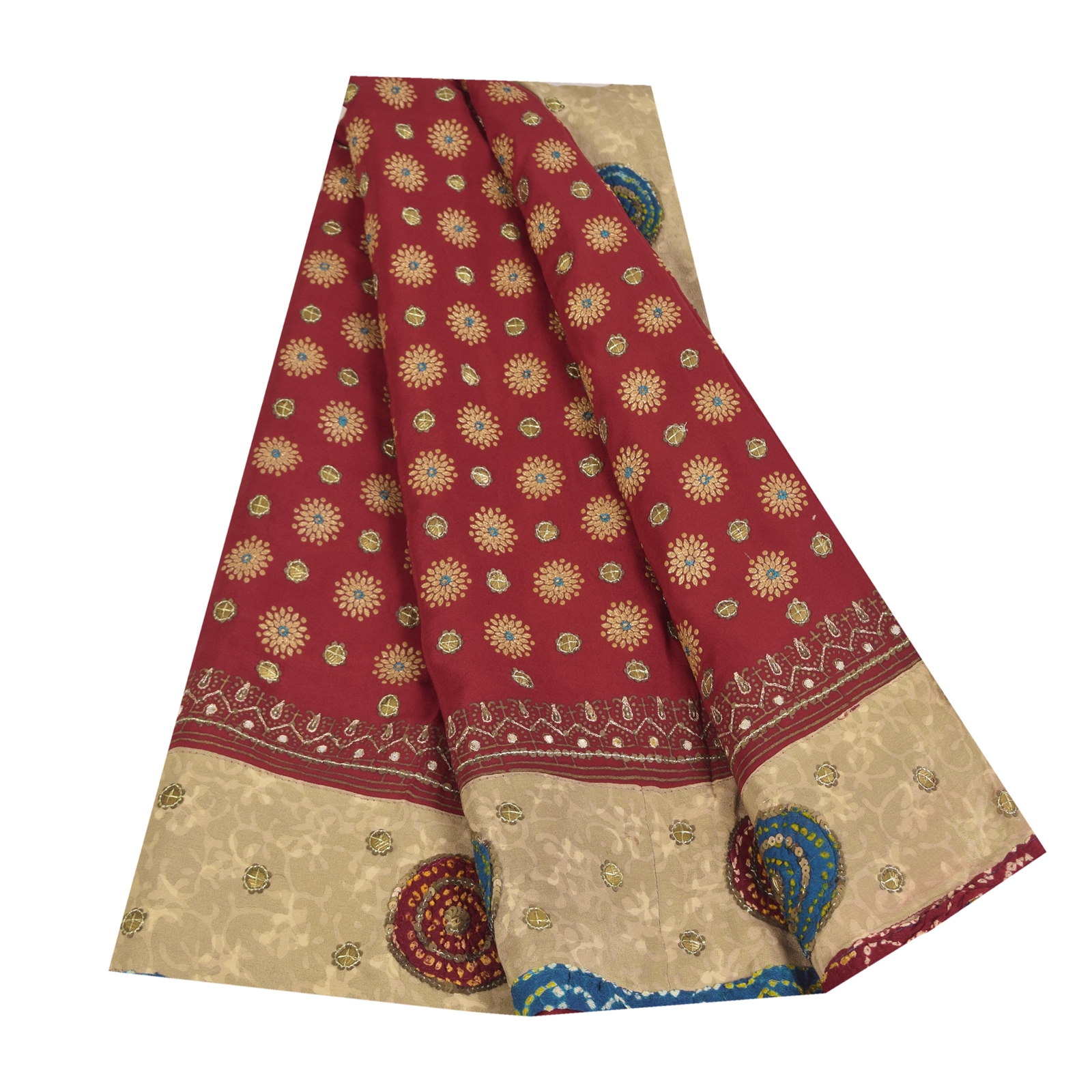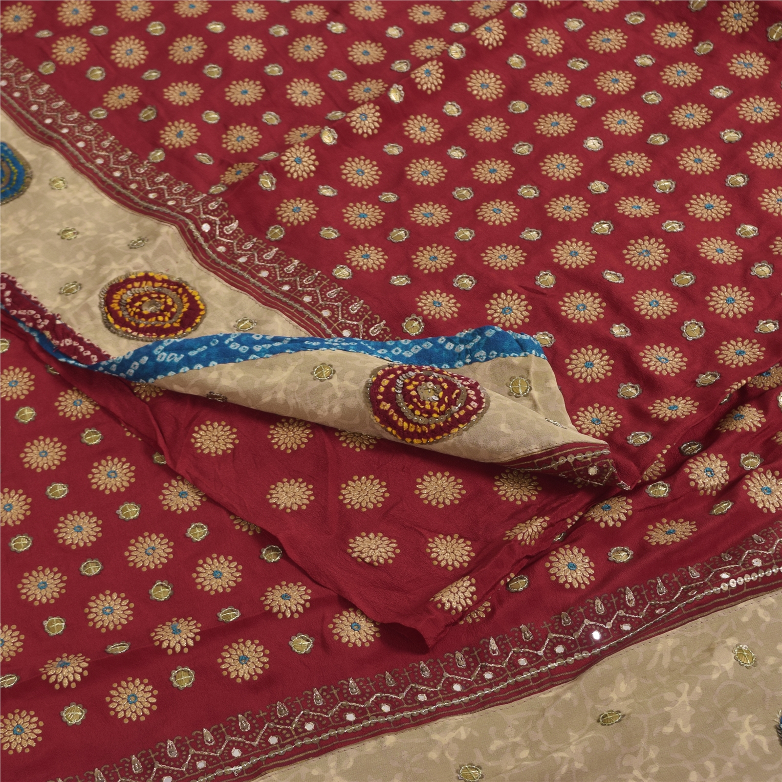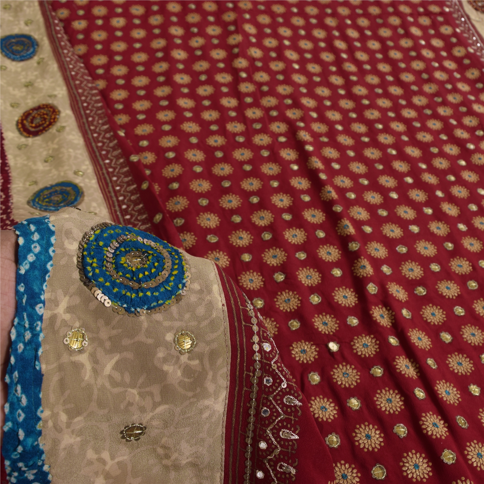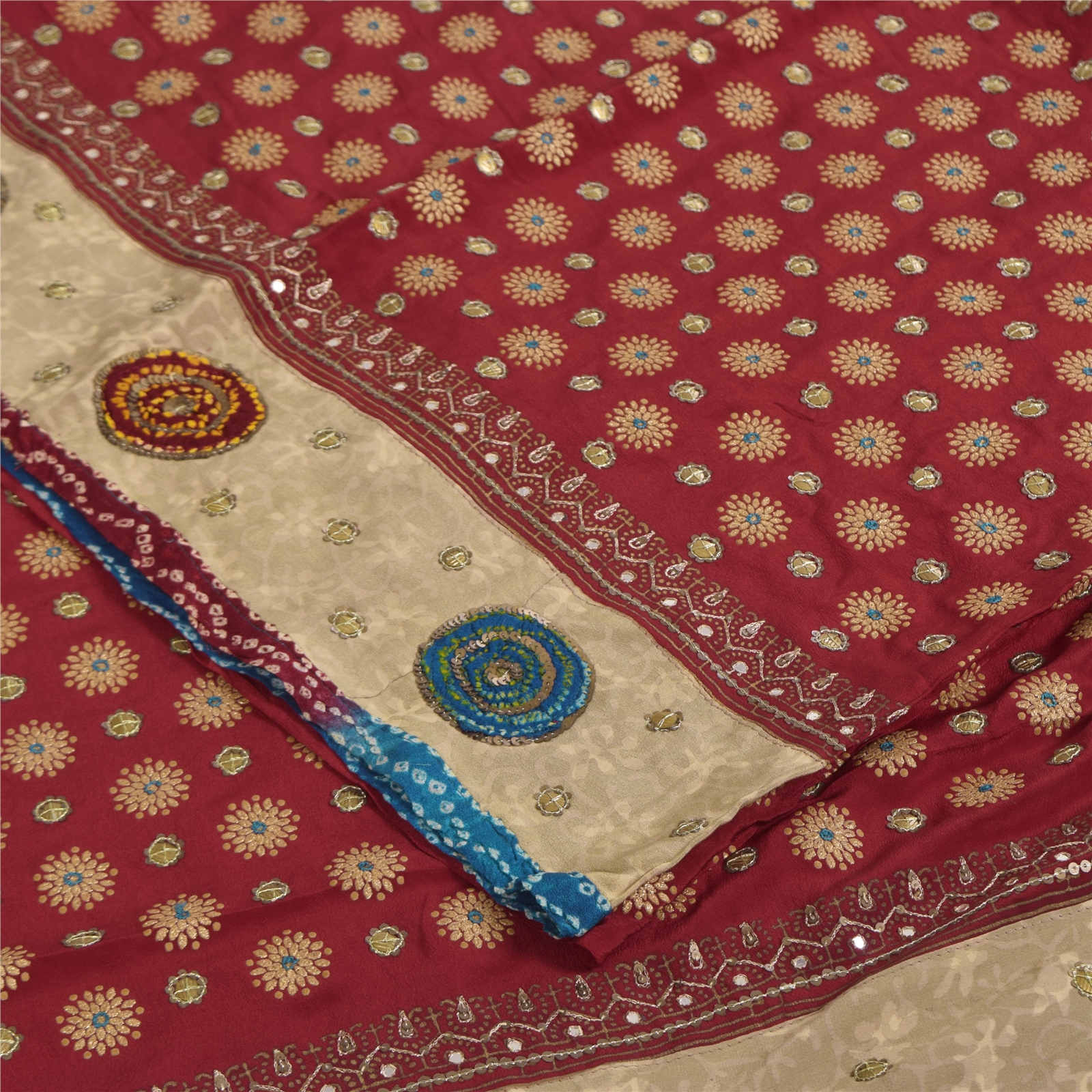 • Border Has Floral Design With Sequins Work & Bandhani Fabric Patch Work.