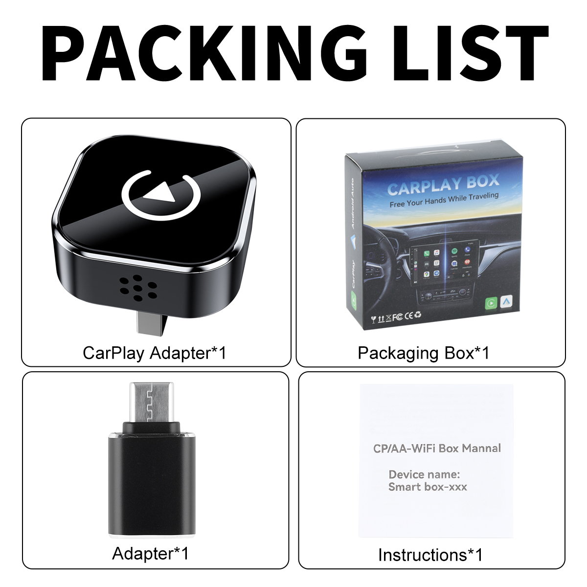 Packing list: Wireless carplay box*1, instruction manual*1, type-c data cable*1