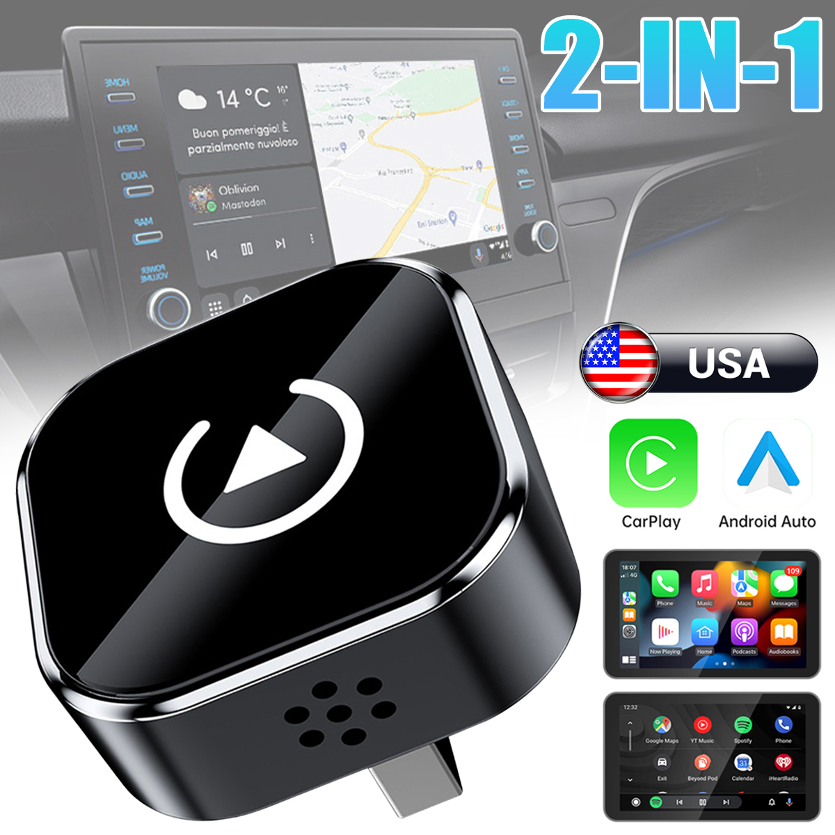 Features:2 in 1 Wireless CarPlay Adapter: Upgrade your wired system to wireless in seconds. Enjoy seamless navigation, Spotify/Apple Music streaming, hands-free calls, and voice commands for a safer drive and tidy dashboard with our ai box.