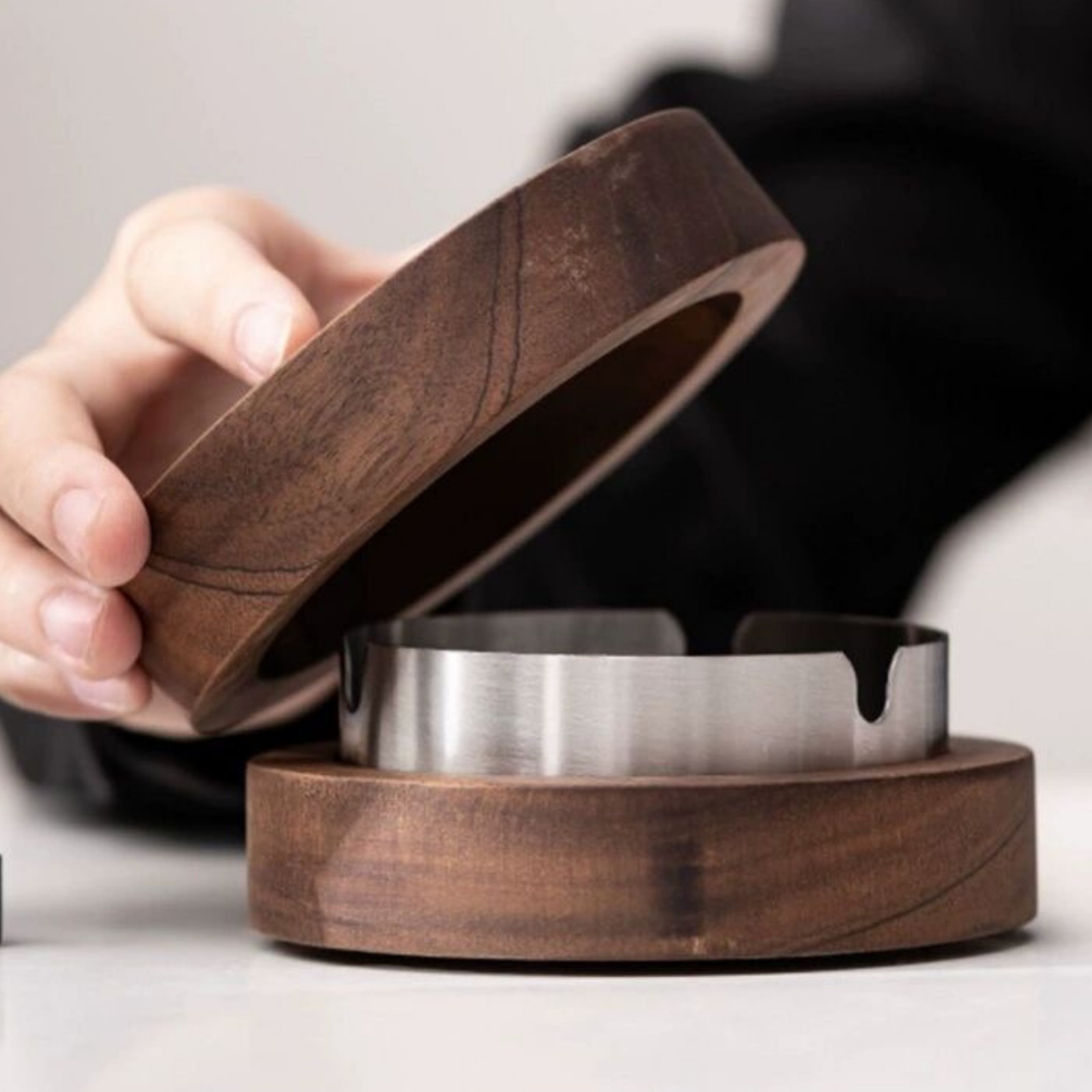 - Abnehmbarer Edelstahl-Aschefänger: Der Innenteil des Aschenbechers besteht aus einem abnehmbaren Edelstahl-Aschefänger, der durch einen Magneten am Boden sicher fixiert wird, um Stabilität zu gewährleisten. Beim Reinigen lässt sich der Innenteil einfach abnehmen und spülen, ohne sich Sorgen zu machen, dass das Walnussholz nass wird – praktisch und benutzerfreundlich.