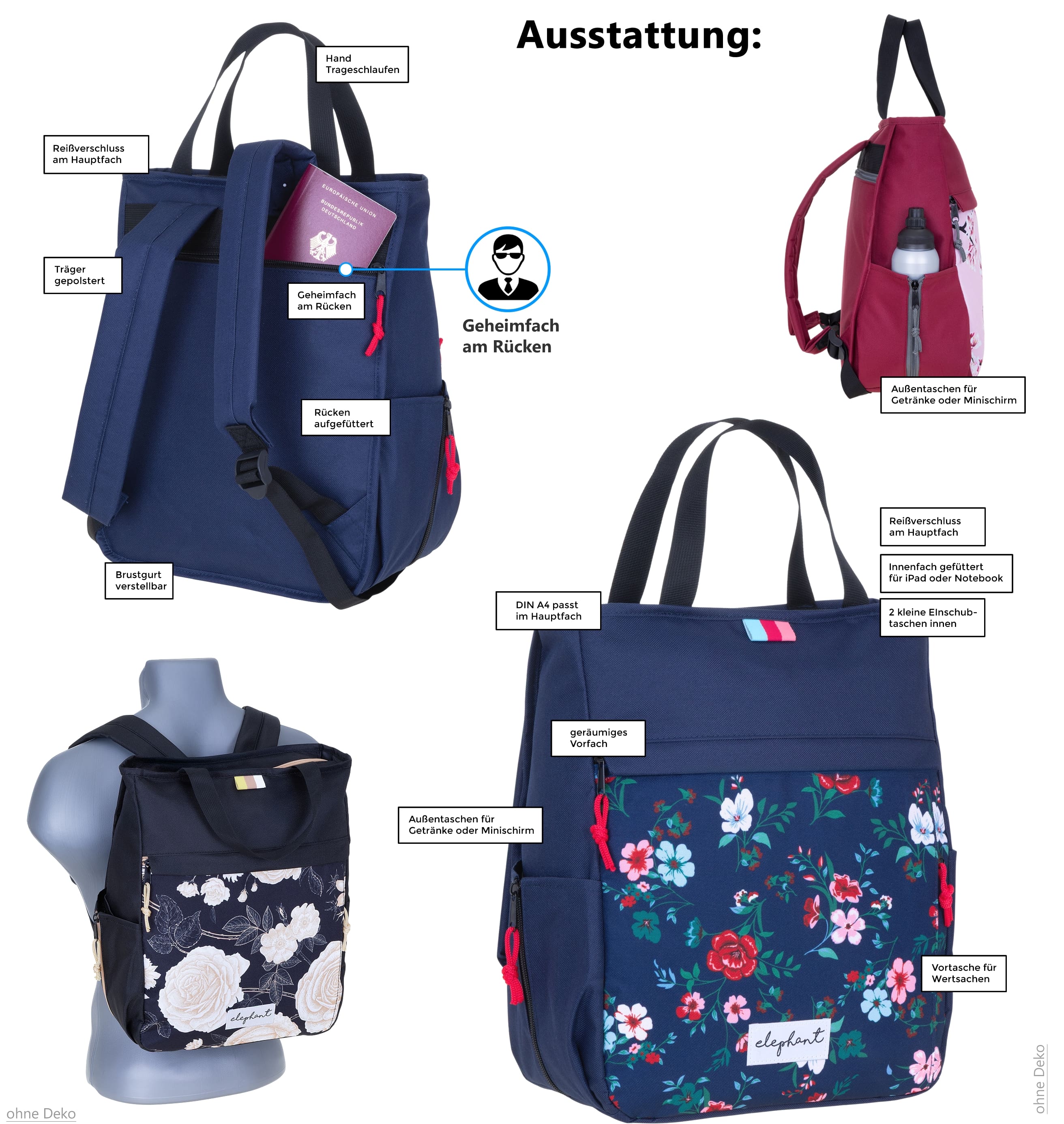 Elephant HYGGE Freizeitrucksack mit Geheimfach am Rücken. Der Elephant Rucksack ist perfekt für den Alltag: modernes skandinavisches Design, viel Innen und Außentaschen. Für Freizeit, Büro oder Sport. Praktische Mittelgröße (Large-Medium), A4 passt im Hauptfach. Praktische Innentasche (auch für Laptopmöglich oder Dein iPad), Wertfach und zwei geräumige Vortaschen mit Reißverschluss sind mit an Bord. In die Außentaschen passen Getränkeflaschen oder Dein Mini-Schirm. Als Rucksack oder als Tasche, immer ein modischer Begleiter. Unisex komplett. Auch der perfekte Reiserucksack (Handgepäck). Blitzschnell vom Fachhändler versendet. Welcher ist Deiner?