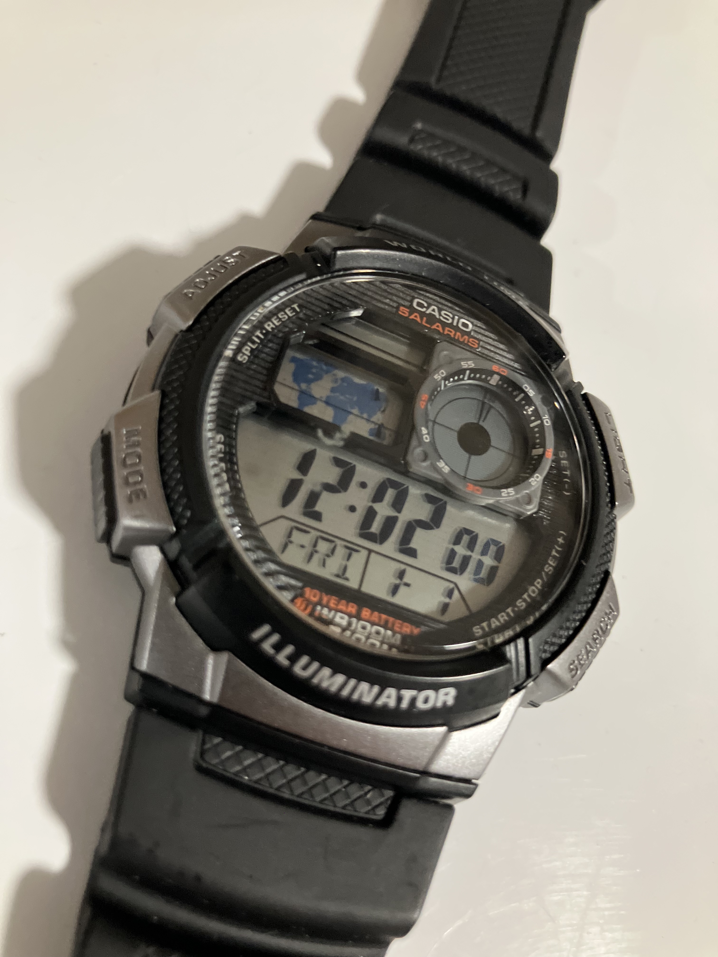 durable, black resin case backgrounds a bold, black dial that features a world