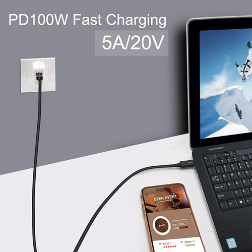 This 100W Thunderbolt 3 cable is capable of charging your laptop and smartphone with power delivery up to 100W and 18W (2A @ 9V) respectively.(Check with your manufacturer for power requirements.)