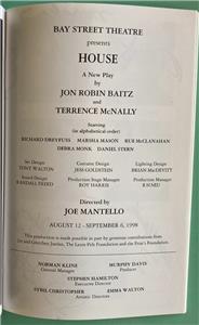 This is a Daniel Stern Signed Color Playbill from House. The stars of this new production of the play are Richard Dreyfuss and Marsha Mason . The Playbill has some creases on the front cover. No rips or tears. The Playbill is dated from The 1998 Season and the play ran from August 12-through September 6 1998. Directed by Joe Mantello.