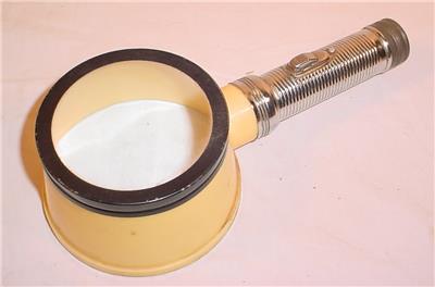 ITEM: Vintage flashlight magnifying glass. Great for stamp collecting or reading fine print items. The magnifier is approximately 3" in diameter.