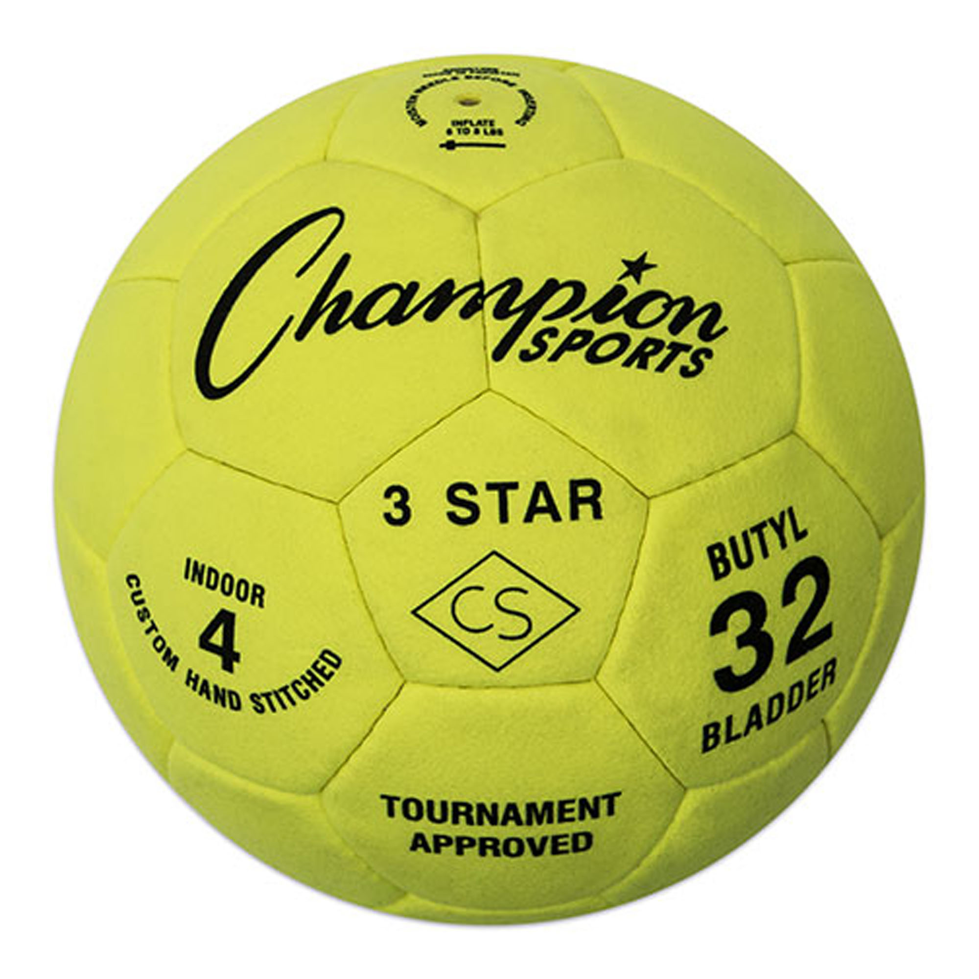 Designed specifically for indoor play, the Champion Sports Three Star Indoor Soccer Ball is made with a custom suede cover for superior softness, making it easy to block and head the ball. The 2-ply butyl bladder offers exceptional air retention so that the ball maintains its shape. The hand-sewn panels on this size 4 indoor soccer ball offer added quality and durability for regular use by gym classes or indoor soccer clubs.