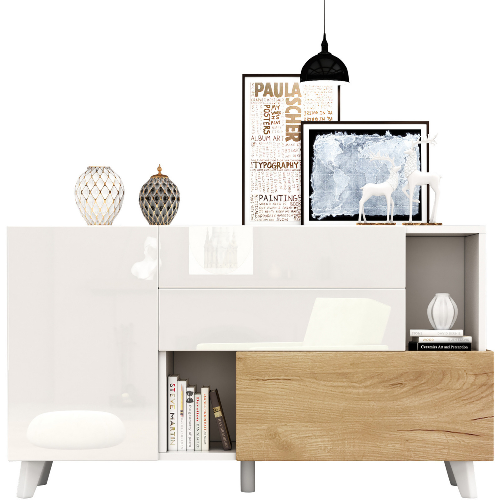Bringen Sie moderne Eleganz in Ihr Zuhause mit diesem stilvollen Sideboard. Die harmonische Kombination aus festen und dekorativen Holzfarben sorgt für ein zeitgemäßes Design, das sich perfekt in jedes Wohnzimmer oder Esszimmer integriert. Es bietet nicht nur ausreichend Stauraum – mit zwei geschlossenen Fächern auf der linken Seite, einem verstellbaren Einlegeboden und zwei offenen Fächern – sondern auch praktische Funktionen wie die innovativen Rückprallstellsetzungen, die das Öffnen der Türen und Schubladen besonders komfortabel machen. Das Sideboard auch bietet 2 geschlossene Fächer unten mit 1 Klappentür. Zudem garantiert das hochwertige, hochglänzende Finish eine elegante Optik und eine pflegeleichte Oberfläche. Die fünf stabilen Füße sorgen für die nötige Stabilität, während die perfekte Aufteilung in Fächer und Schubladen für Ordnung und Übersicht sorgt. Ideal für alle, die Funktionalität und Stil vereinen möchten.