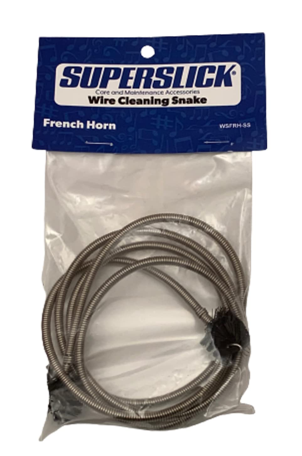 Superslick Cleaning Snake, French Horn, Wire Flexible coiled wire cleaning snake, with bristle brush ends, thoroughly cleans the interior grime from your French Horn. Packaged in a bag with header
