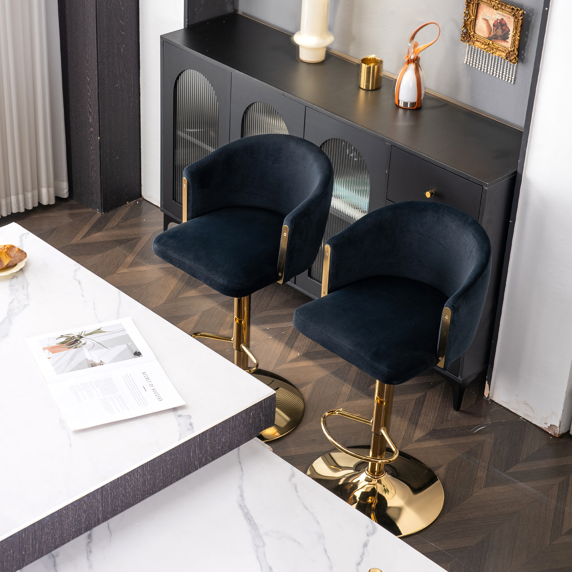 Bringen Sie Eleganz in Ihr Zuhause mit diesen 2 Barhockern aus Samt und modernem Goldfuß. Höhenverstellbar und drehbar für flexible Nutzung, dazu gepolsterte Lehne und Armstützen für besten Komfort. Ideal für Kücheninseln, Hausbars oder Essbereiche – Design trifft auf Funktion.