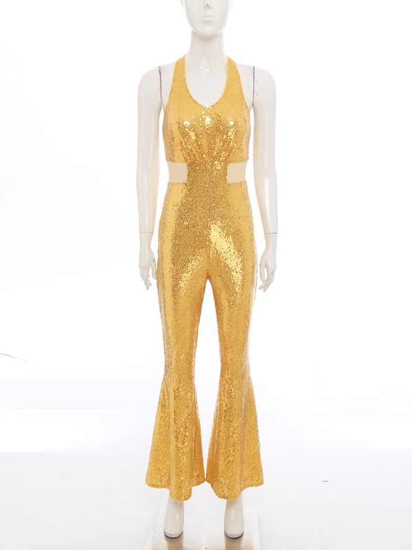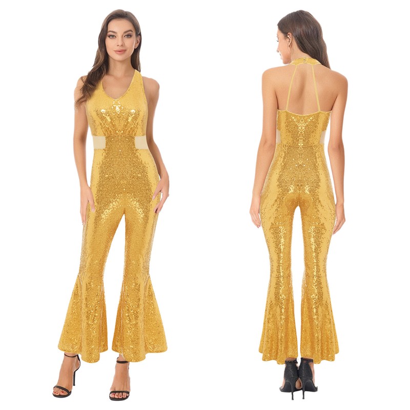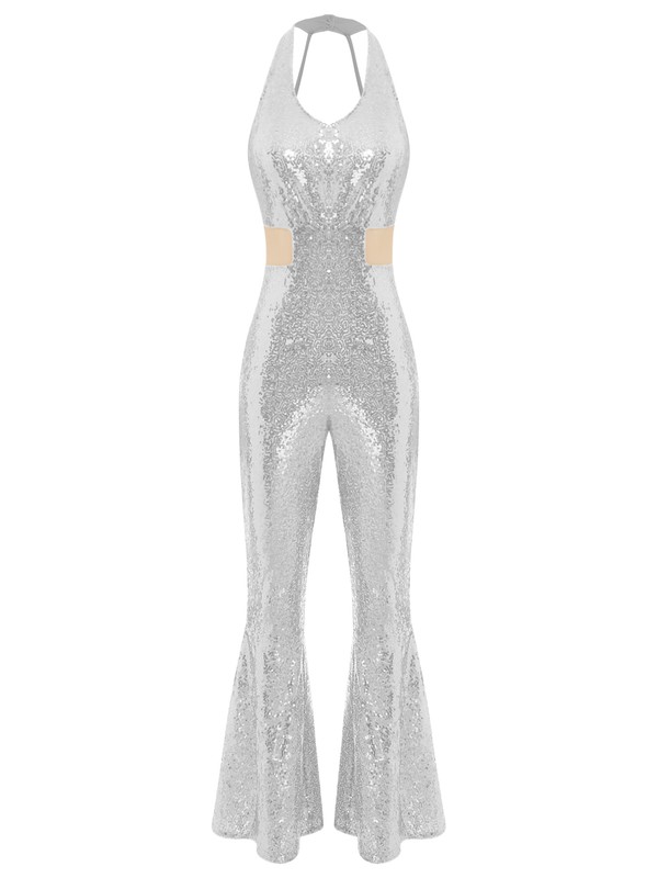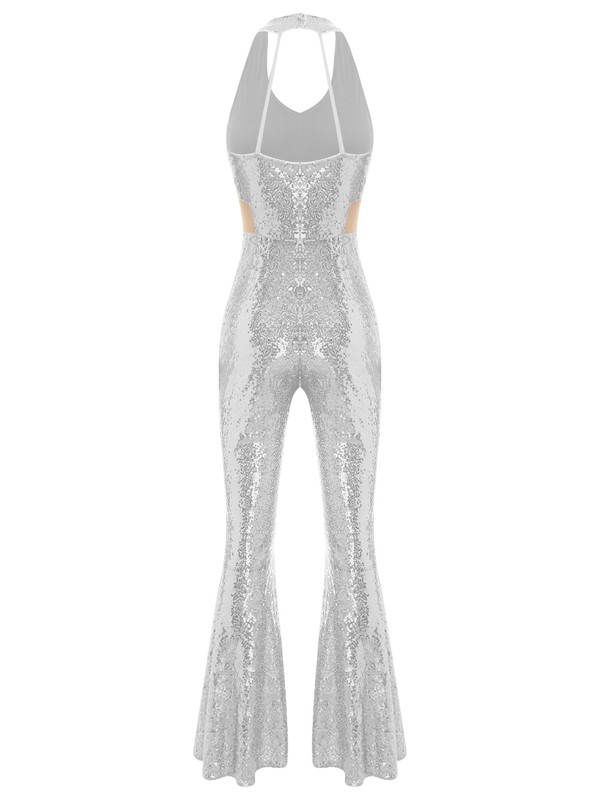 Made from a blend of polyester, sequin, and spandex, this jumpsuit is stretchy and offers a comfortable fit, allowing for easy movement on the dance floor.