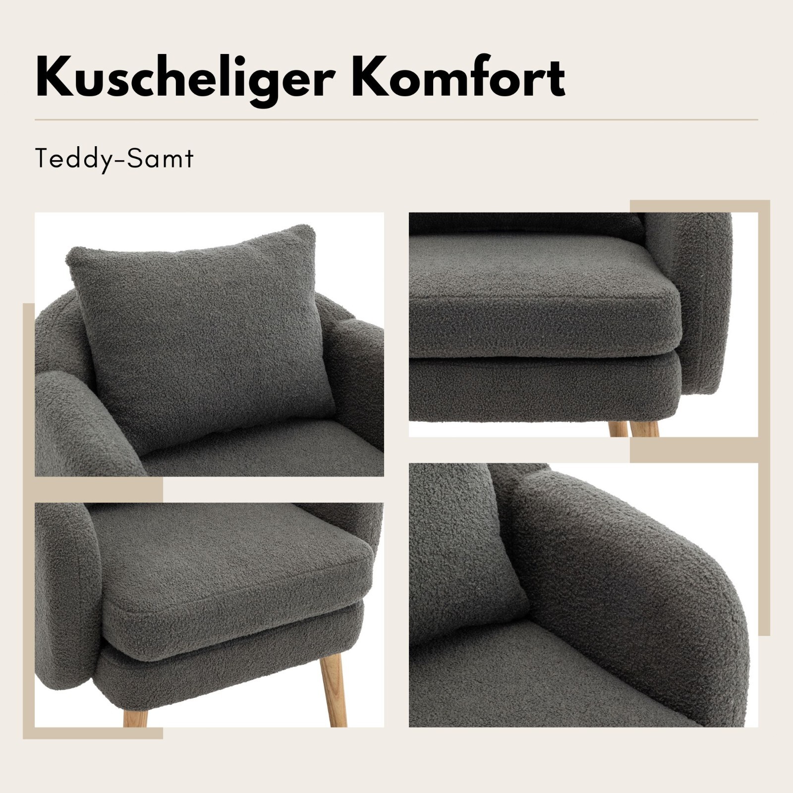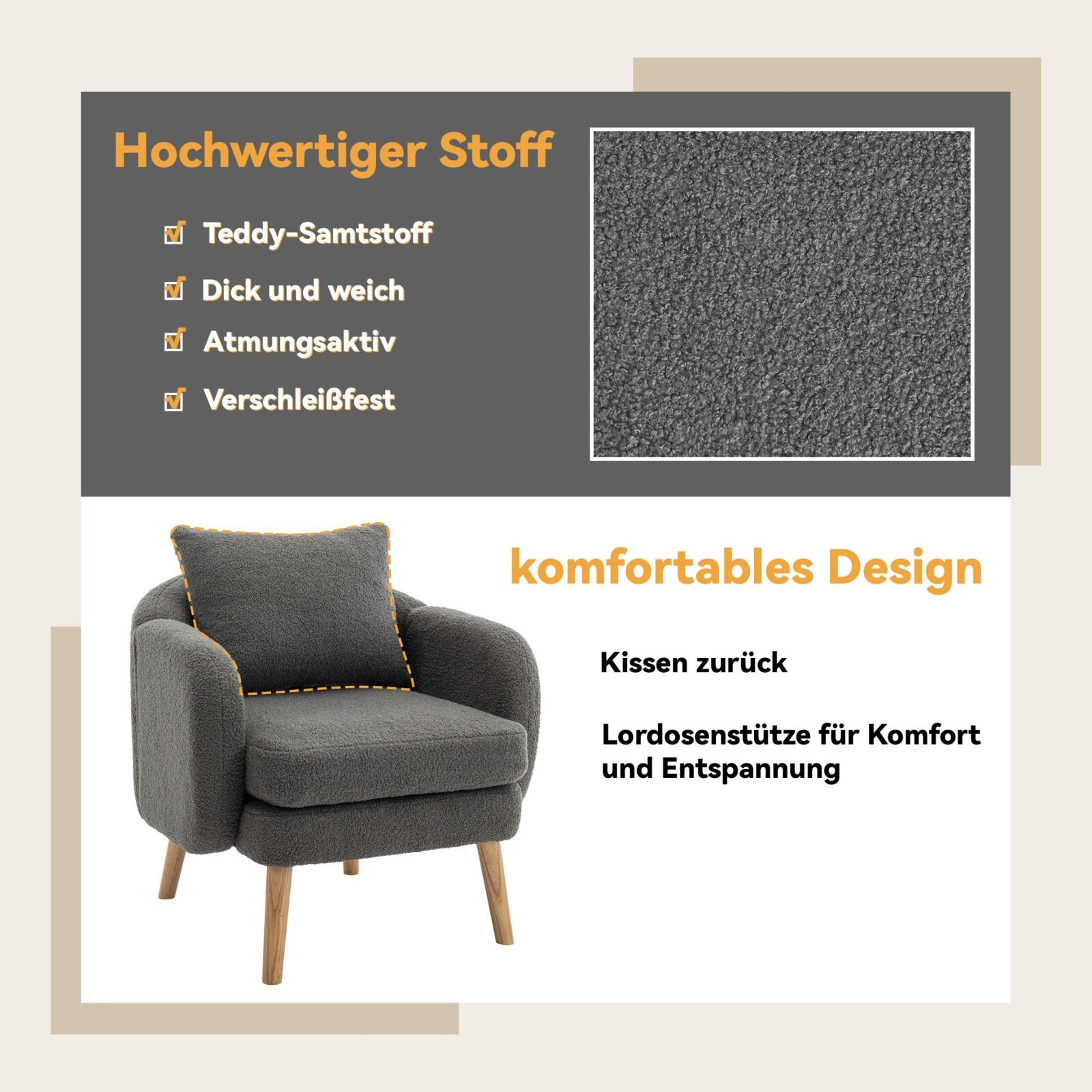 Wir präsentieren unseren Komfort-Loungesessel, wo Luxus auf Funktionalität trifft. Erleben Sie himmlischen Komfort mit unserem 14 cm dicken Kissen und robusten Stuhlbeinen aus massivem Holz, die bis zu 150 kg tragen können. Halten Sie die Frische leicht mit abnehmbaren Kissen aufrecht und wählen Sie aus vier stilvollen Farben, um jedes Dekor zu ergänzen. Plus, genießen Sie eine problemlose Montage in nur 10 Minuten, perfekt für alle Erfahrungsstufen.