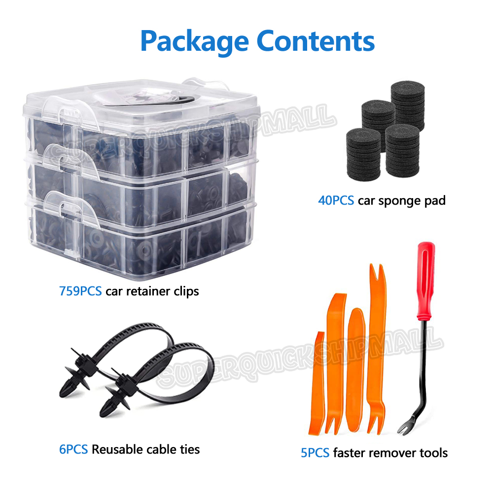 - Quantity: 759pcs+5*Fastener Remover Tools +6*Car Cable Ties+40*Car Sponge-Cushion