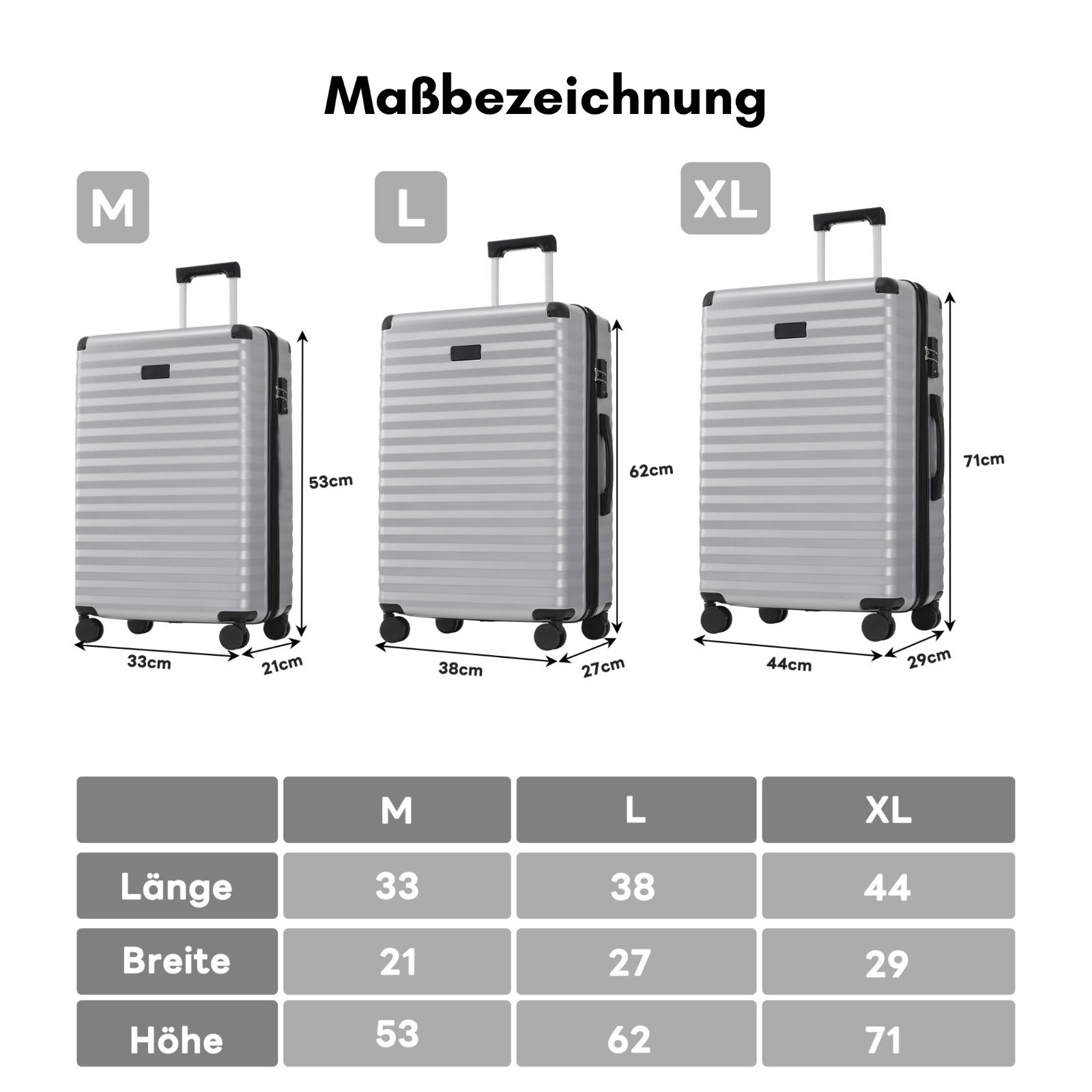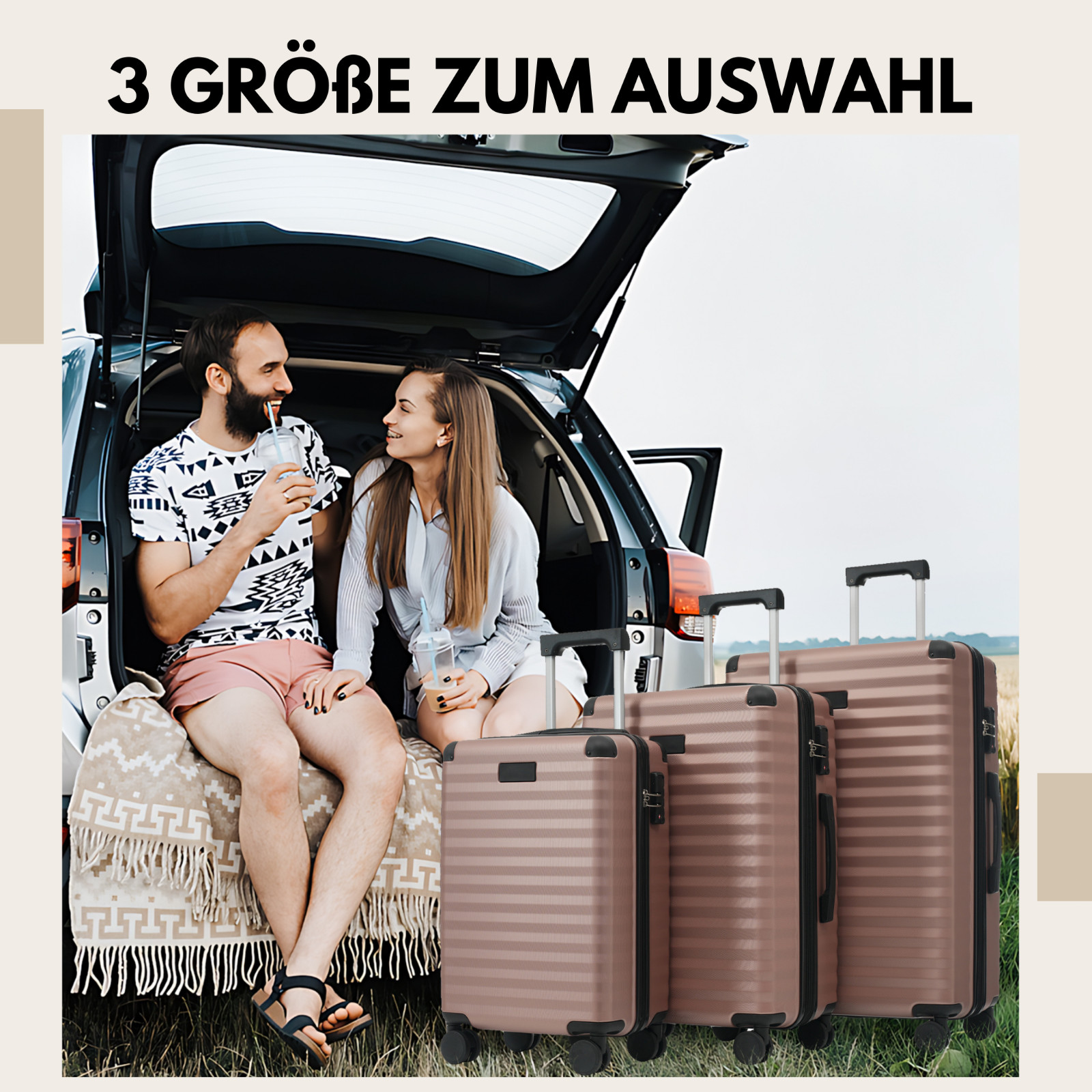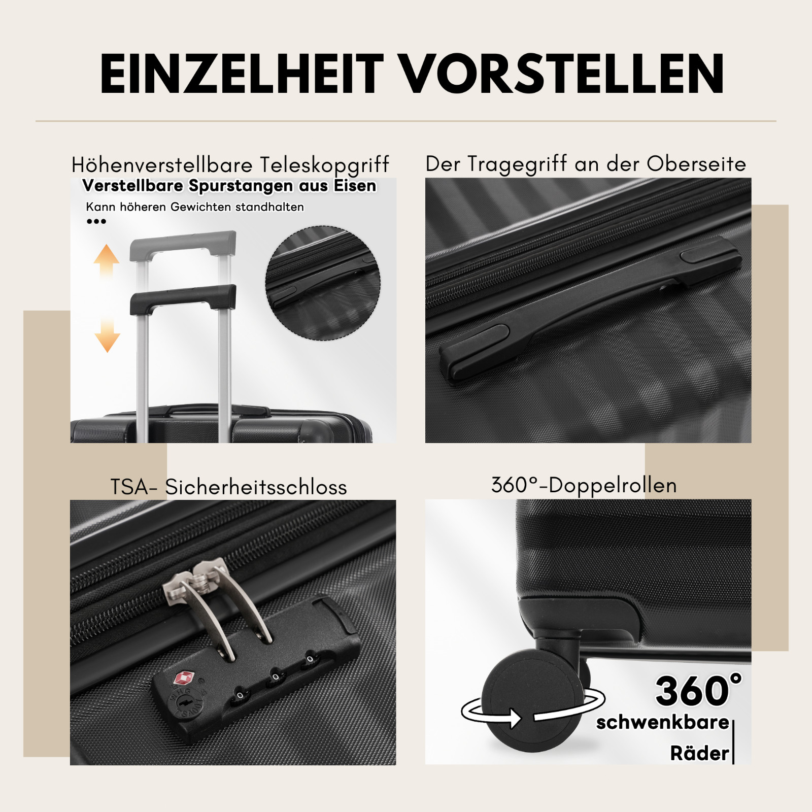 Dieses 3-teilige Rollkoffer-Set kombiniert Funktionalität, Sicherheit und Komfort – perfekt für kurze Trips oder lange Reisen. Jedes Gepäckstück bietet einen eigenen Oben-Tragegriff, während die größeren Varianten (L & XL) zusätzlich mit seitlichen Griffen und stabilen Stützbeinen ausgestattet sind. Besonders praktisch: Der mittlere Koffer verfügt über eine klappbare Getränkehalterung, die unterwegs schnell griffbereit ist. Alle Koffer sind mit robusten Eckenschützern versehen und lassen sich dank der 360° drehbaren Doppelrollen mühelos manövrieren. Das Teleskopgestänge aus Metall sorgt für Stabilität beim Ziehen. Im Inneren bieten ein elastischer X-Gurt, eine Mesh-Tasche sowie ein separates Reißverschlussfach durchdachten Stauraum. Die Größen L und XL lassen sich durch eine erweiterbare Reißverschluss-Schicht zusätzlich vergrößern – ideal, wenn unterwegs mehr Platz gebraucht wird. Abgerundet wird das Set durch integrierte TSA-Zahlenschlösser für internationale Sicherheit beim Reisen.