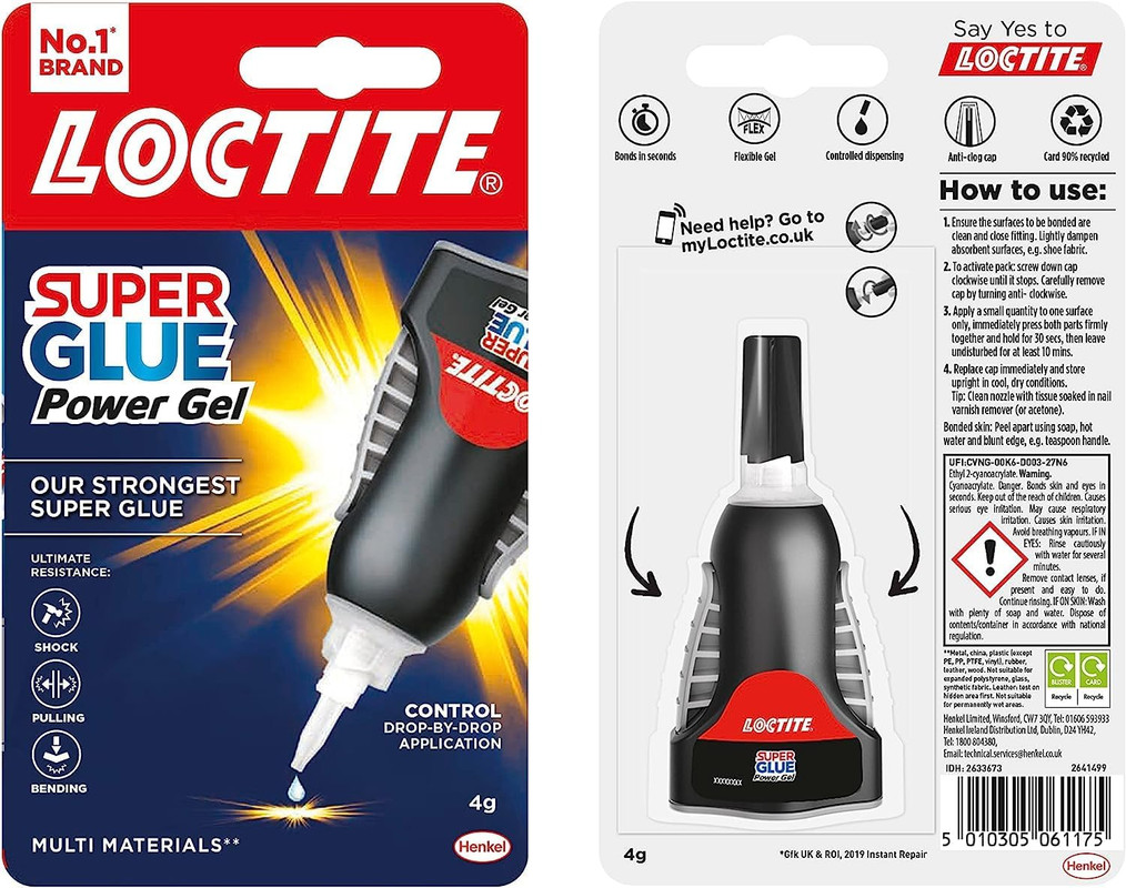 The all purpose glue is resistant to both weather and shock while being able to withstand heavy loads. It bonds in seconds and dries transparent