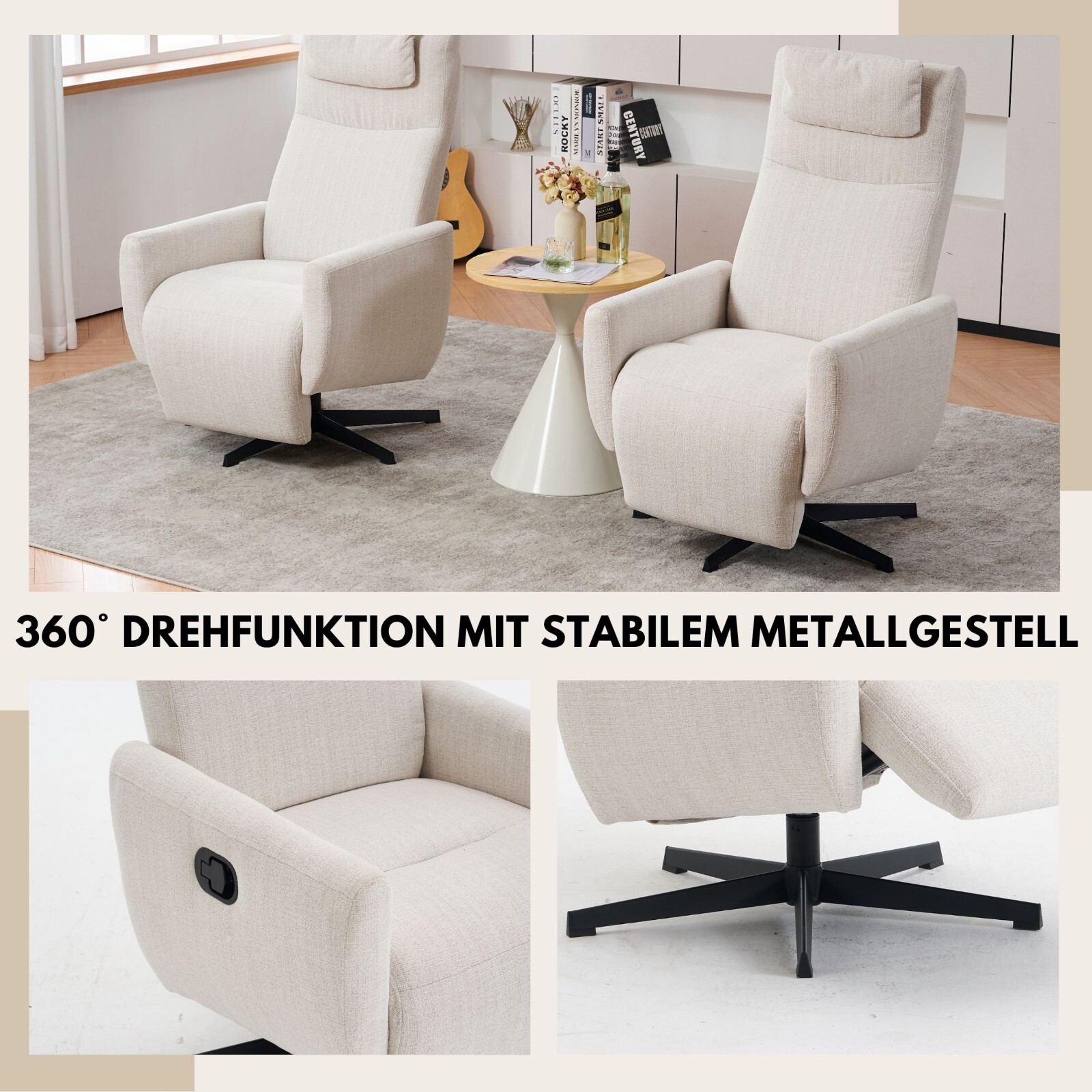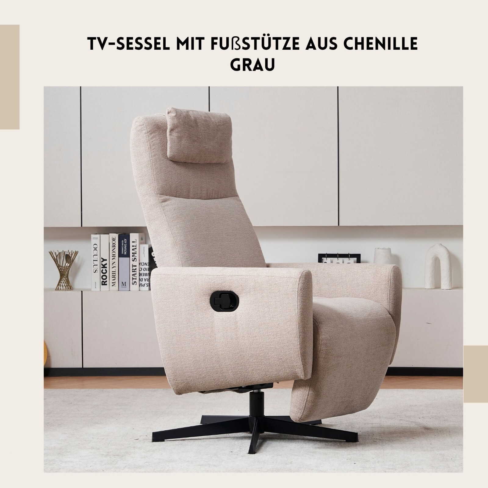 Genießen Sie modernen Komfort mit diesem stilvollen TV-Sessel mit 110°–150° neigbarer Rückenlehne und passender Fußstütze. Der weiche Chenille-Stoff sorgt ganzjährig für angenehme Atmungsaktivität. Ein ergonomisches Kopfkissen entlastet den Nacken, während der 360° Drehfuß sanftes Bewegen ermöglicht. Das stabile Metallgestell trägt bis zu 110 kg und ist in nur 10 Minuten aufgebaut – für stilvolle Entspannung in Ihrem Zuhause.