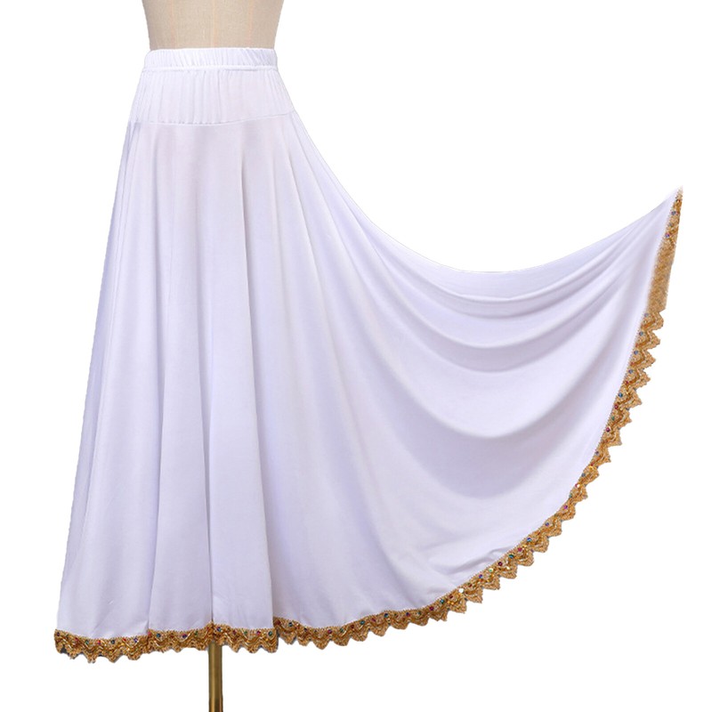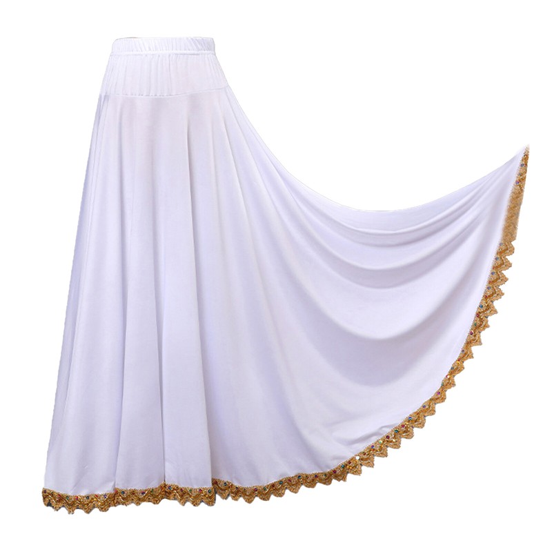The gold trim adds a glamorous and eye-catching element, making the skirt stand out in any dance performance or party, in line with the current love for glittery details.