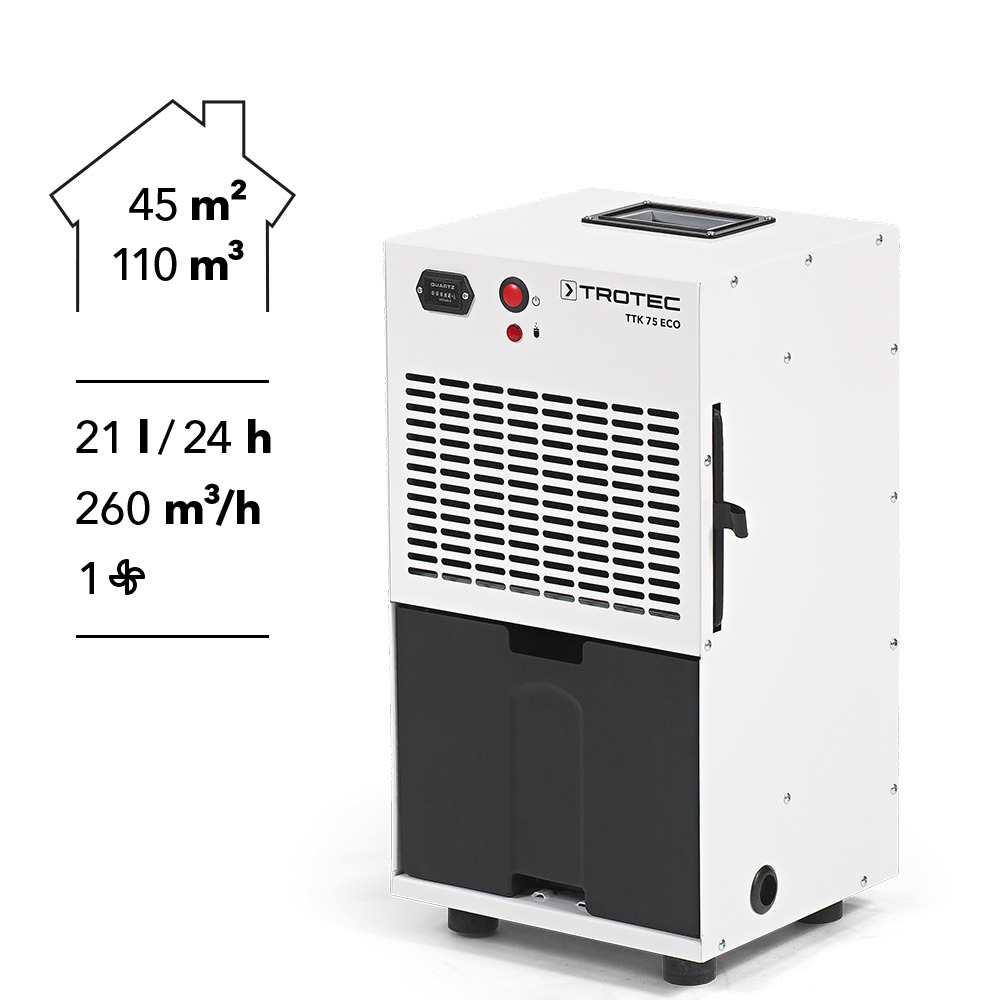 Durch den externen Kondensatablauf und die optional erhältliche Kondensatpumpe eignet sich der TTK 75 ECO zudem optimal für längere unbeaufsichtigte Trockenhaltungseinsätze, deren Dauer sich mit dem integrierten Betriebsstundenzähler exakt ermitteln lässt – ideal besonders bei gewerblichen Anwendungen.