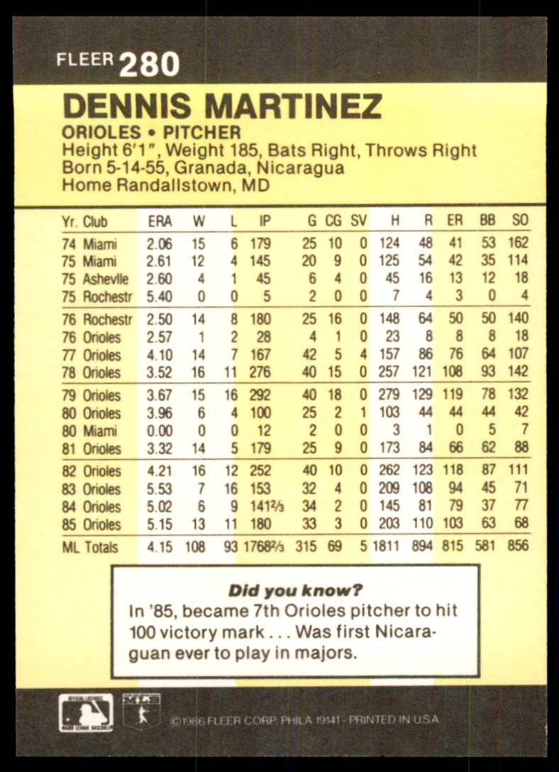 | 1986 Fleer Dennis Martinez Baseball Cards #280 |
