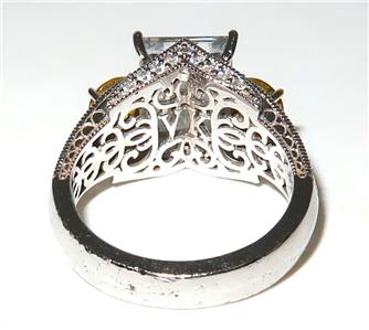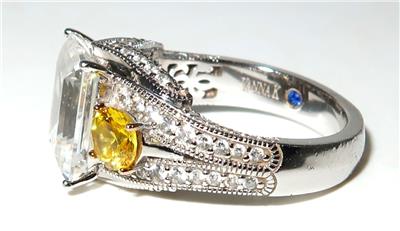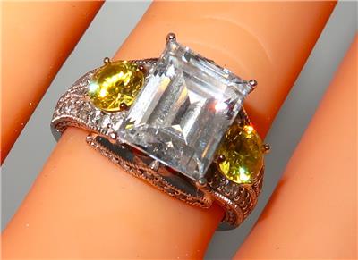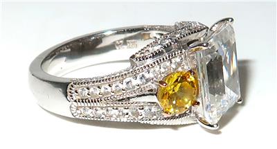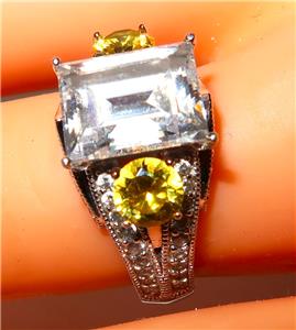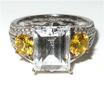 You have found the missing piece to your jewelry collection! Here is a simply brilliant statement ring from VANNA K. It features an emerald cut center cubic zirconia that measures 10mm by 8mm. There is a yellow round cubic zurconia set on either side of the center stone. The remainder of this 925 sterling silver ring is covered in pave diamonds. The size is 7 1/2. It is in excellent preowned condition and is ready for its new home. Please see our Not Just China Store for more jewelry and other collectibles.