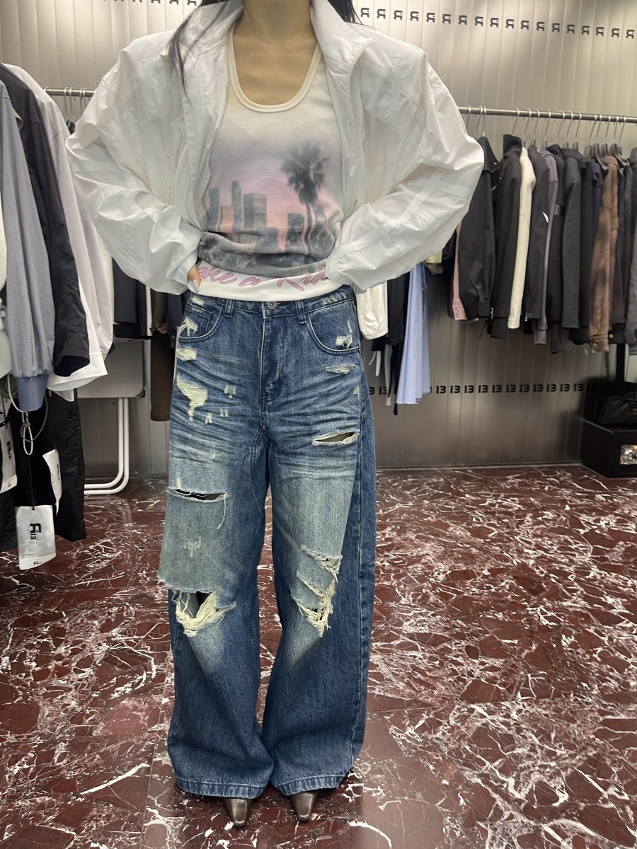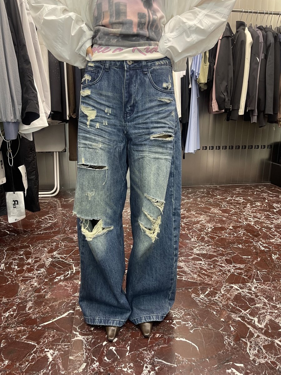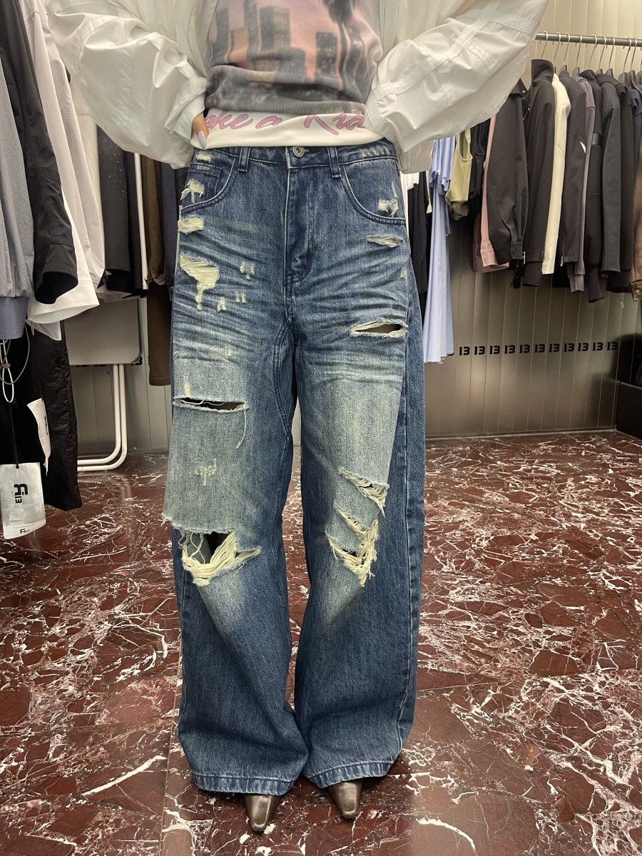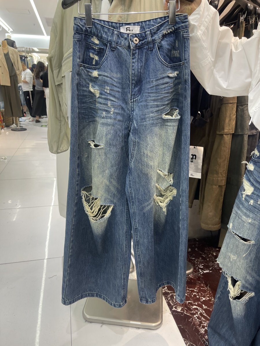 R13 Ripped Jeans Vintage, Loose Wash Straight Wide Leg Pants Mopping Trousers