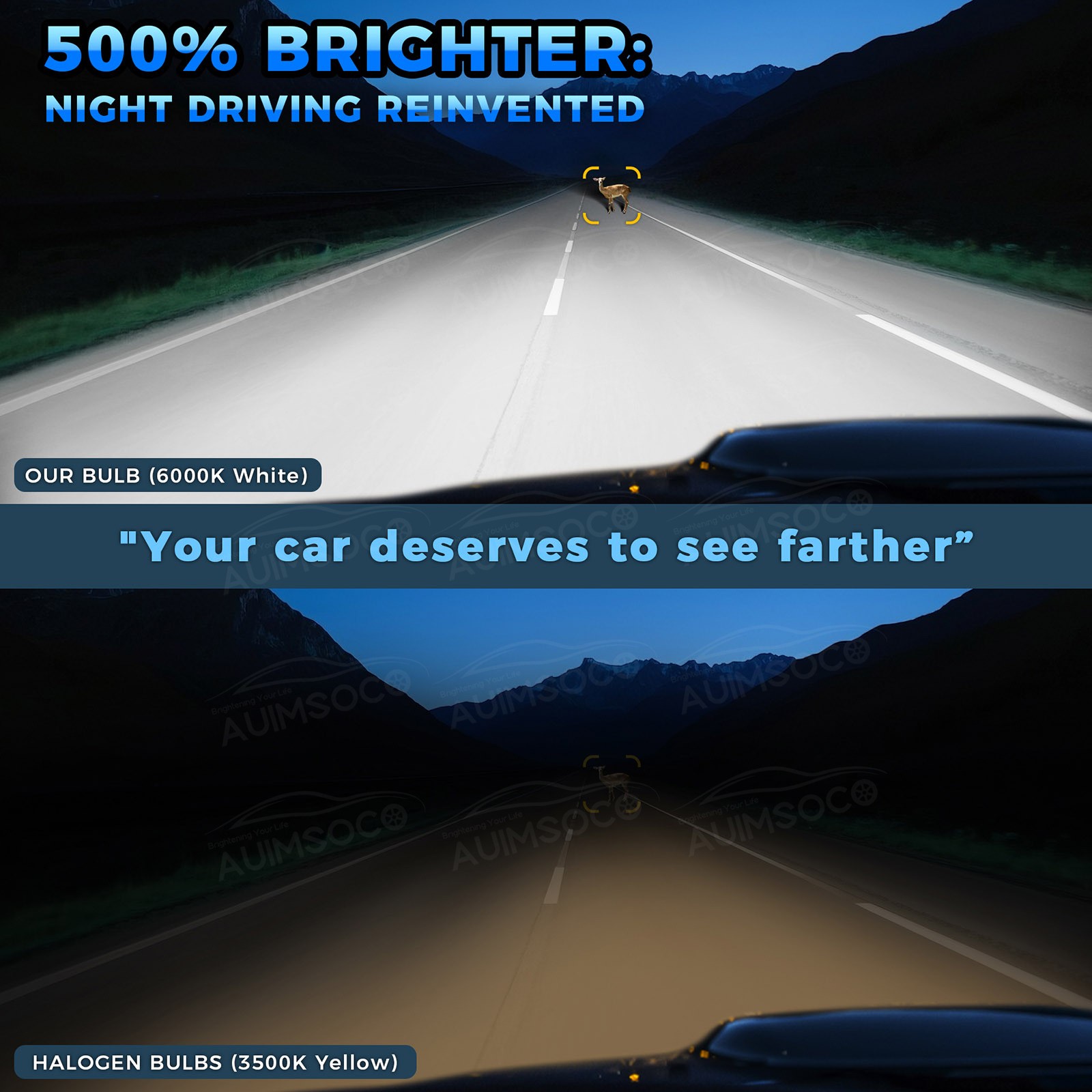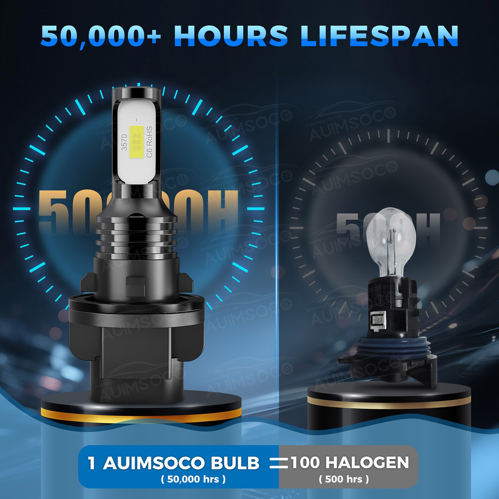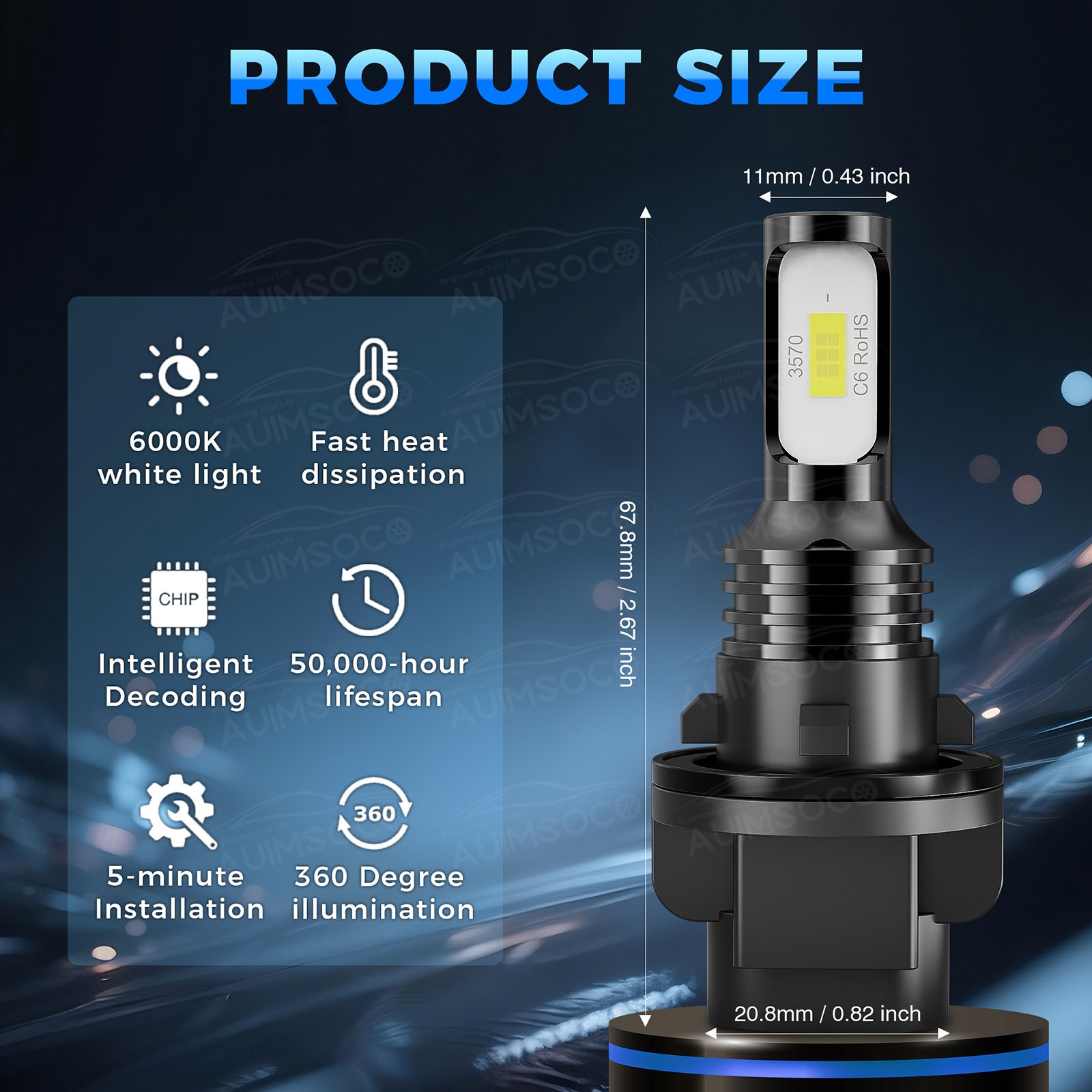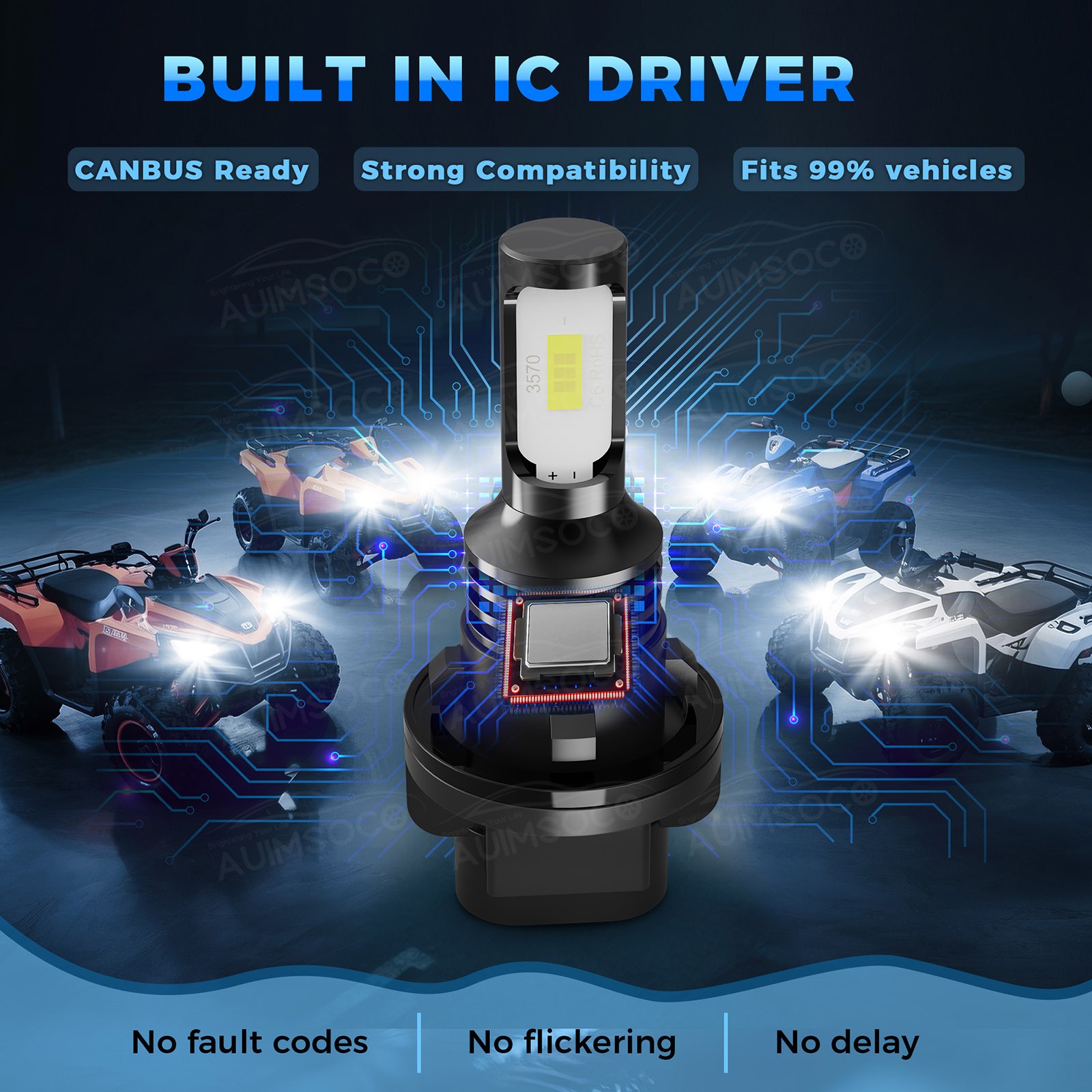 【Perfect Beam, No Dark Spots】AUIMSOCO ATV/UTV led healight bulb uses a 1:1 halogen beam design and ultra-thin chip copper plate to ensure 360° illumination without black spots. Will not turn a blind eye to oncoming traffic and drivers, driving at night is safer