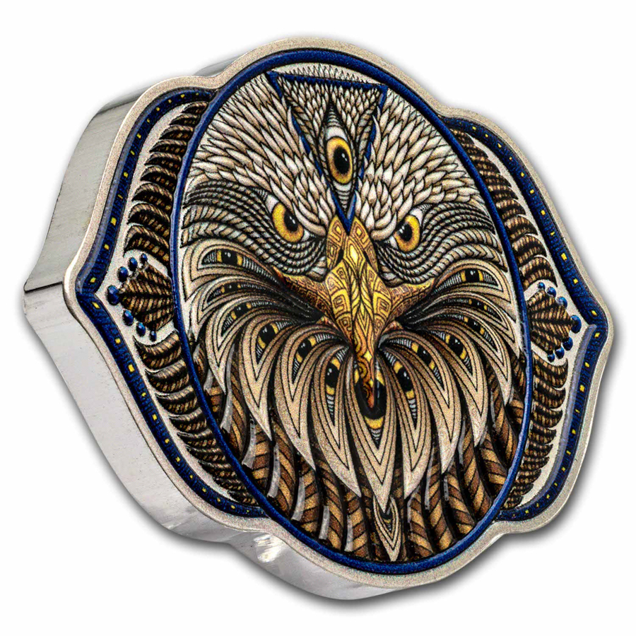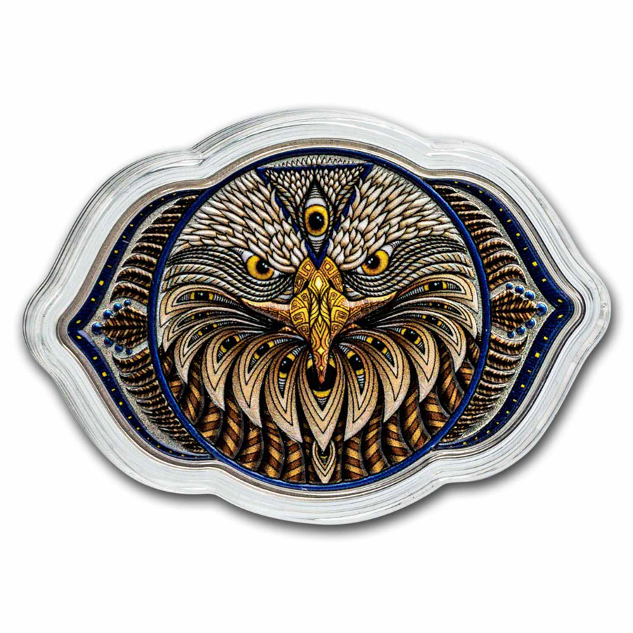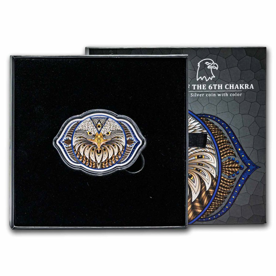 This coin is the fifth in the Seven Chakras series featuring the 6th chakra, also known as the third eye, located in the center of the forehead. It acts as our source of intuition and imagination. When our third eye chakra is open, we are able to see ourselves and the world around us more clearly. With a sharp third eye, we can cut through fabricated illusions. If we shift our perspective beyond the physical plane, we can access deeper truths. Focus like an eagle with this 2 oz fine silver legal tender coin engraved and with vibrant color.