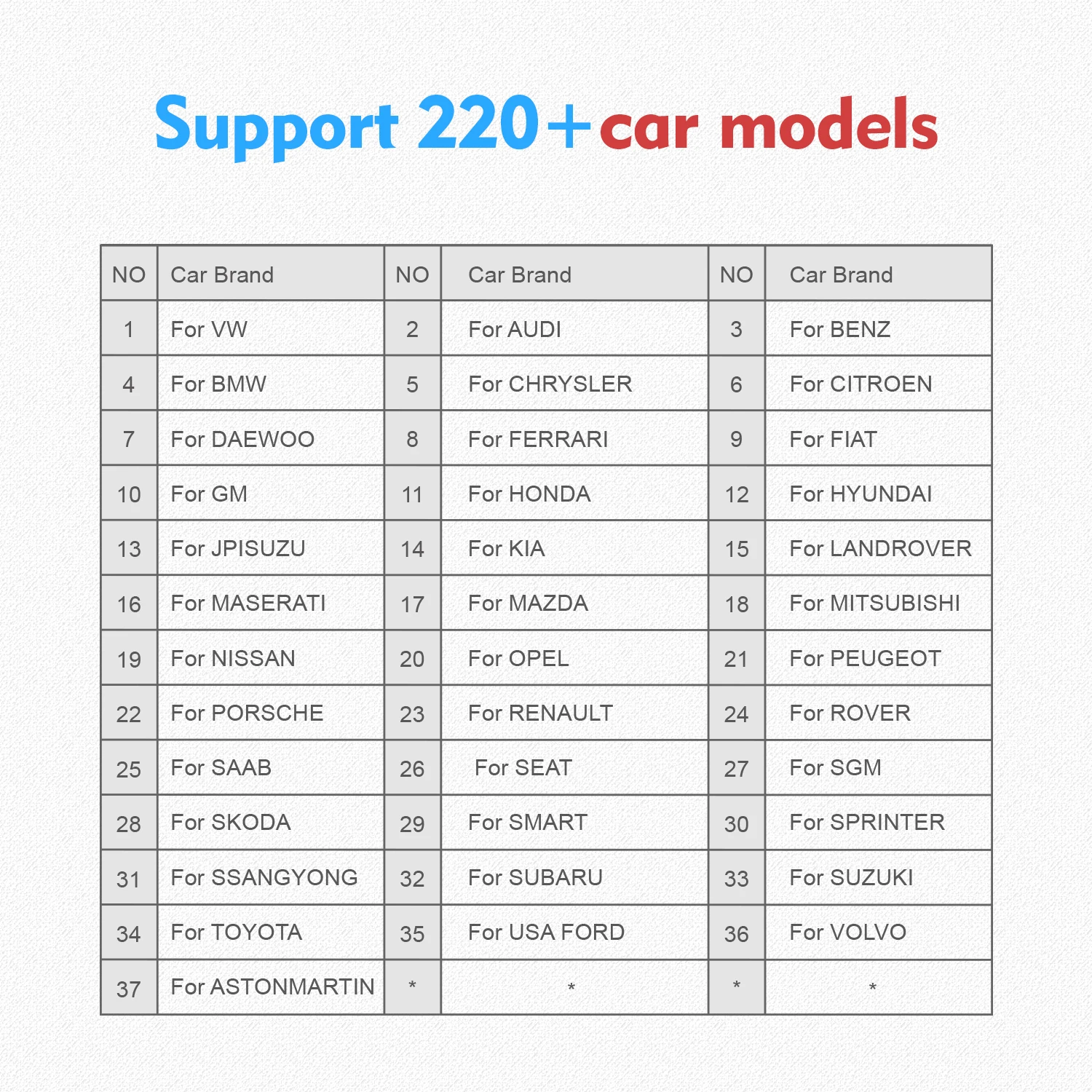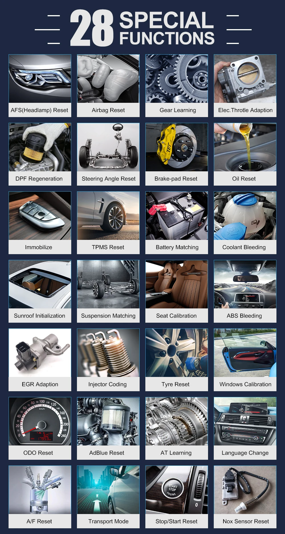 | Supported System | ABS, DPF, EPB, SAS, SRS, TPMS, Engine, Oil Reset, Gear Learning, Injector Coding, IMMO, Transmission, All System+28 Special Reset Function |