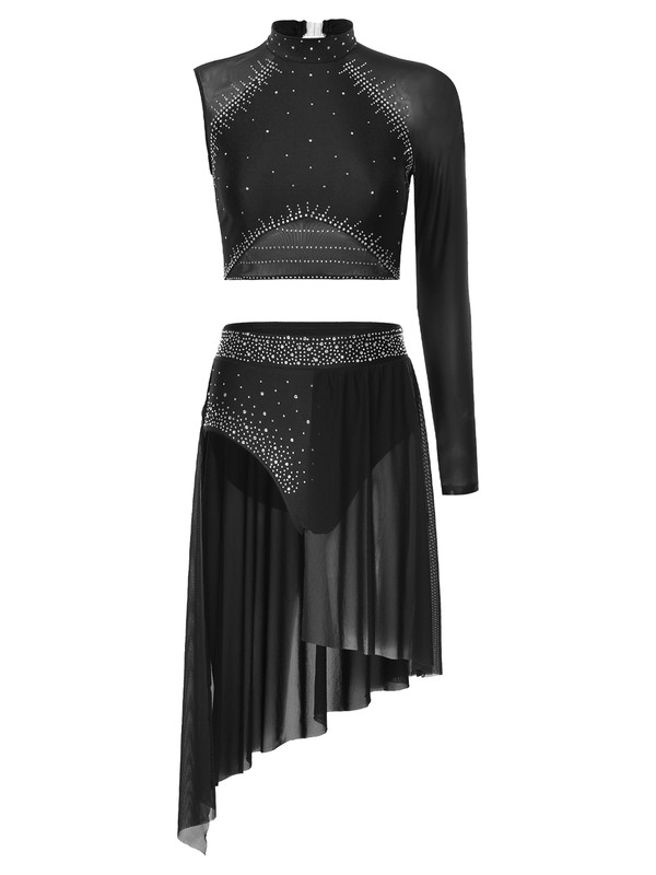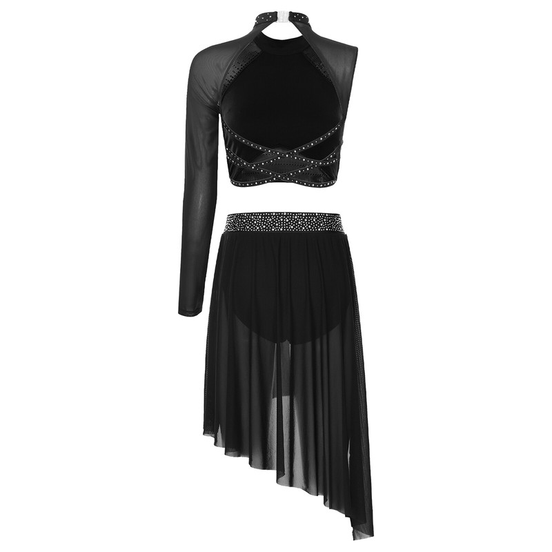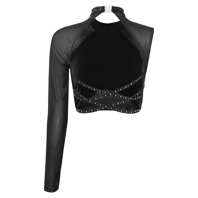 An unique dance crop top with sheer mesh long sleeve on one side and sleeveless on the other.