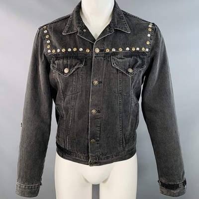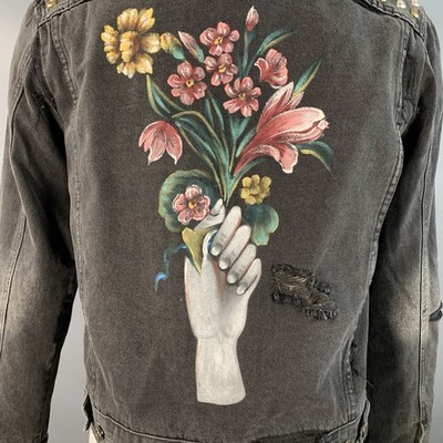 GUCCI Size M Hollywood Grey Painted Cotton Distressed Studded Denim Jacket IN-STORE ID: 140788GUCCI "Hollywood" jacket in a grey cotton denim featuring silver tone and gold tone metal studded shoulders, painted "HOLLYWOOD" back with hand holding floral bouquet, distressed details, and button closure. Made in Italy. Original Retail Price (if known): $0.00 Category: Jacket More Details Brand: GUCCI Chest Size: M Size: M Gender: Male Color: Grey Pattern: Painted Fabric: Cotton Style: Distressed Country of Origin: Italy Age Group: Adult