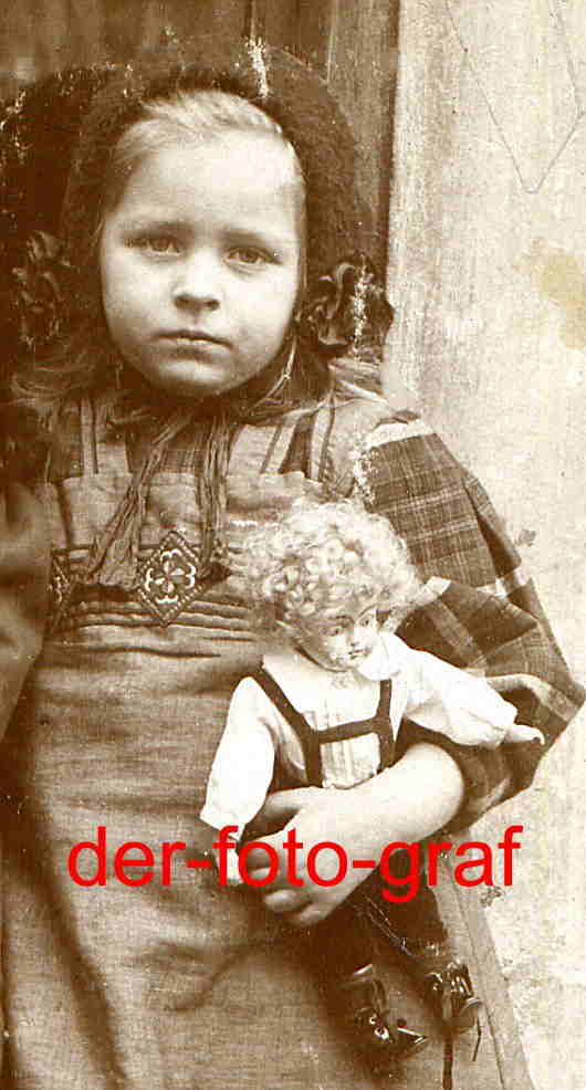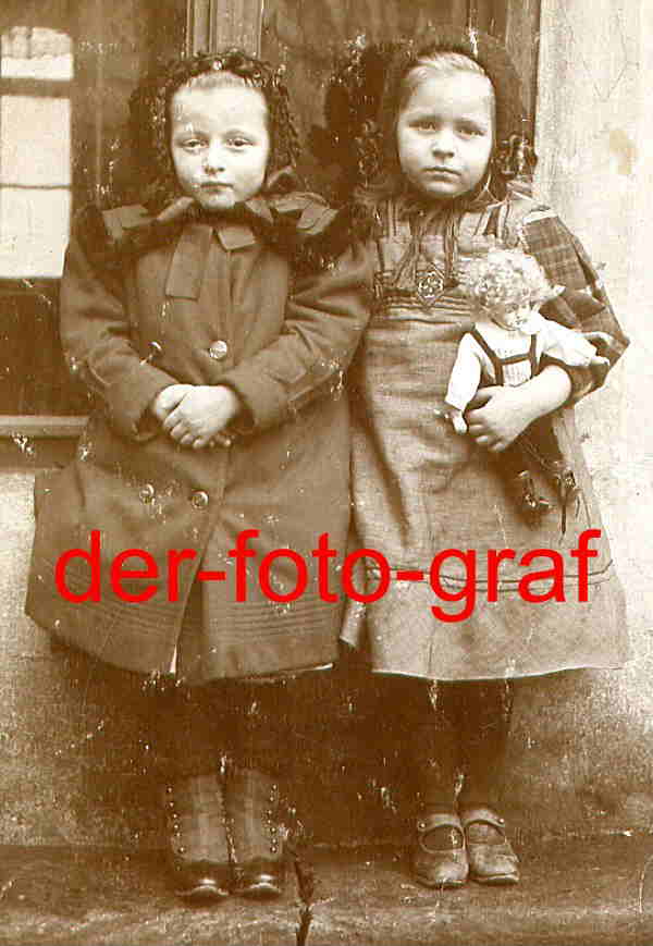 Foto, Privatfoto, 2 kleine Maedchen stehen auf einer Steinbank vor dem Haus, das rechte Kind mit einer Puppe, um 1908
