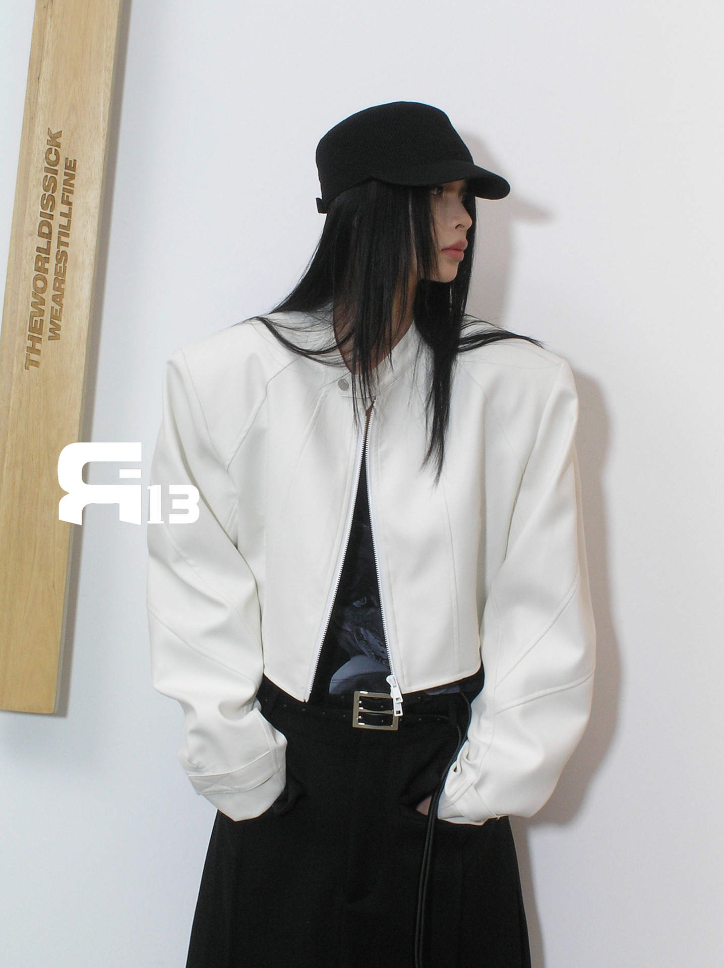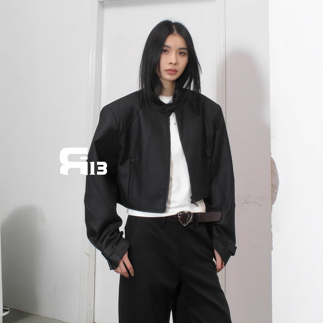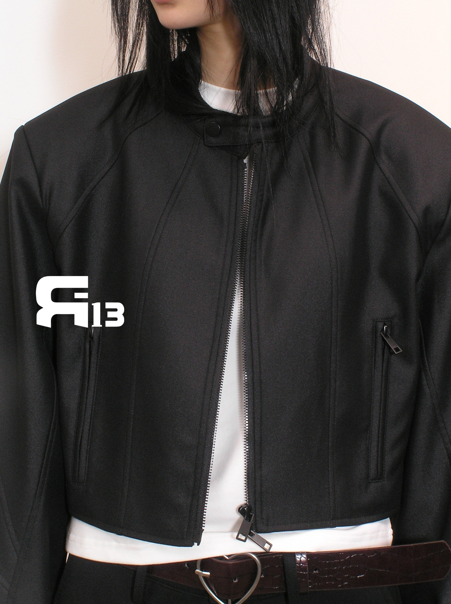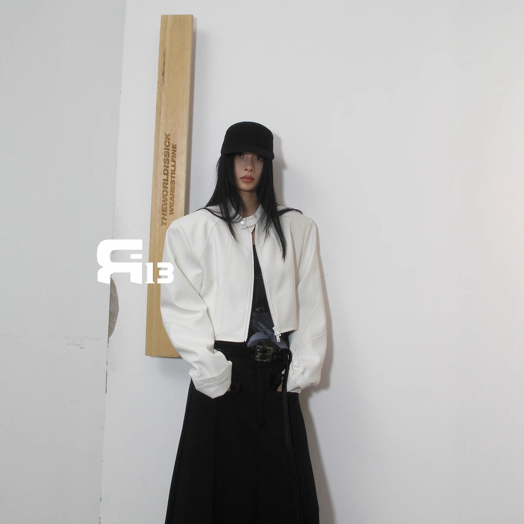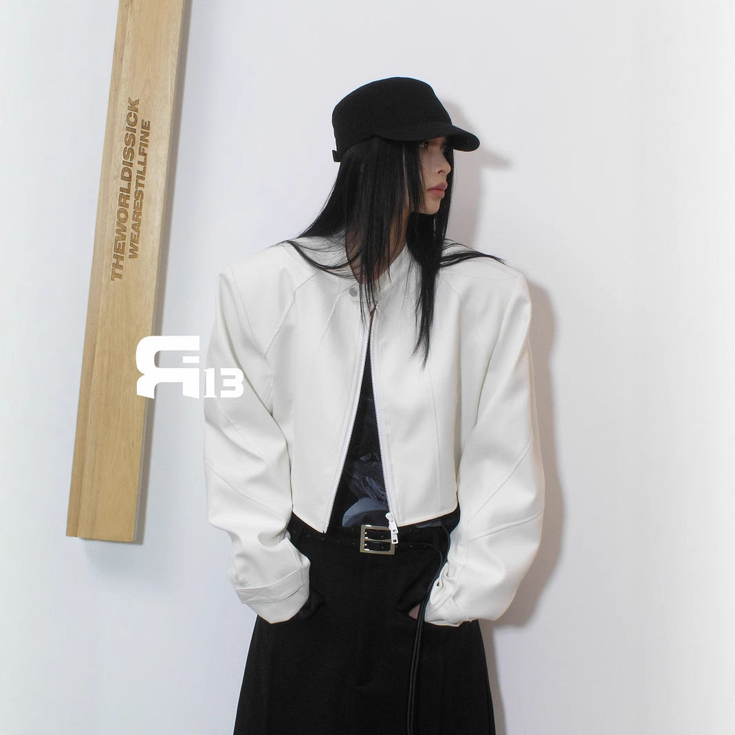 R13 Faux Leather Short Zipper Jacket Jacket Long Sleeve Cardigan Black / White