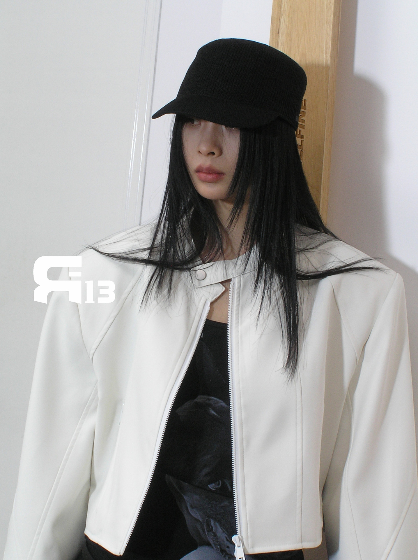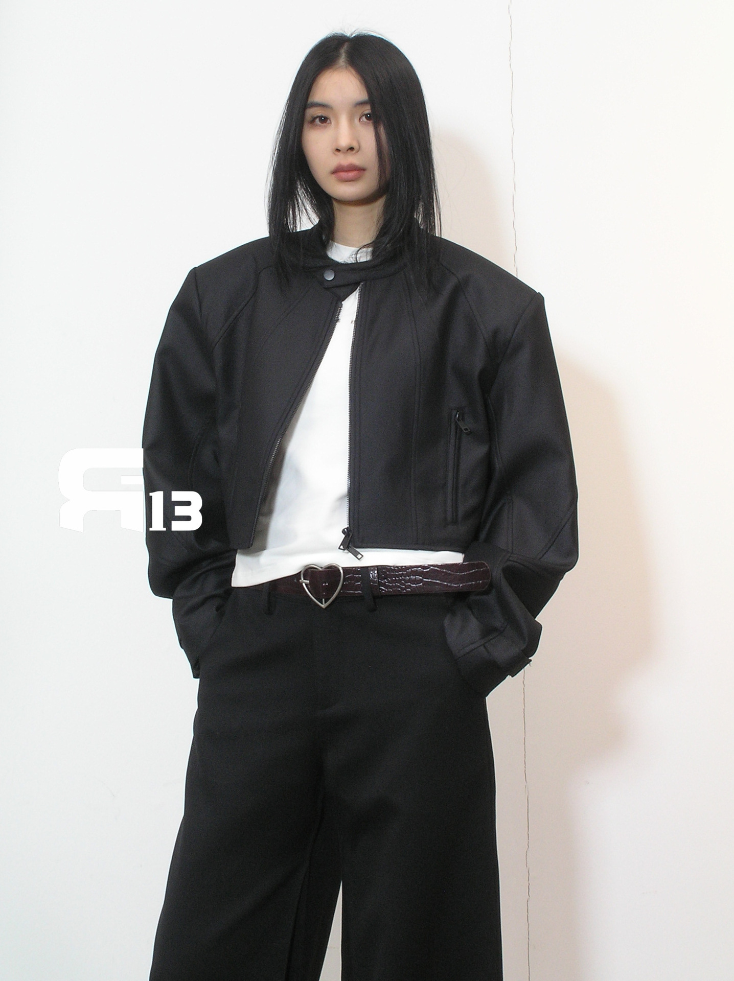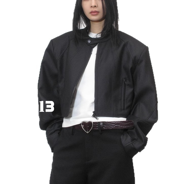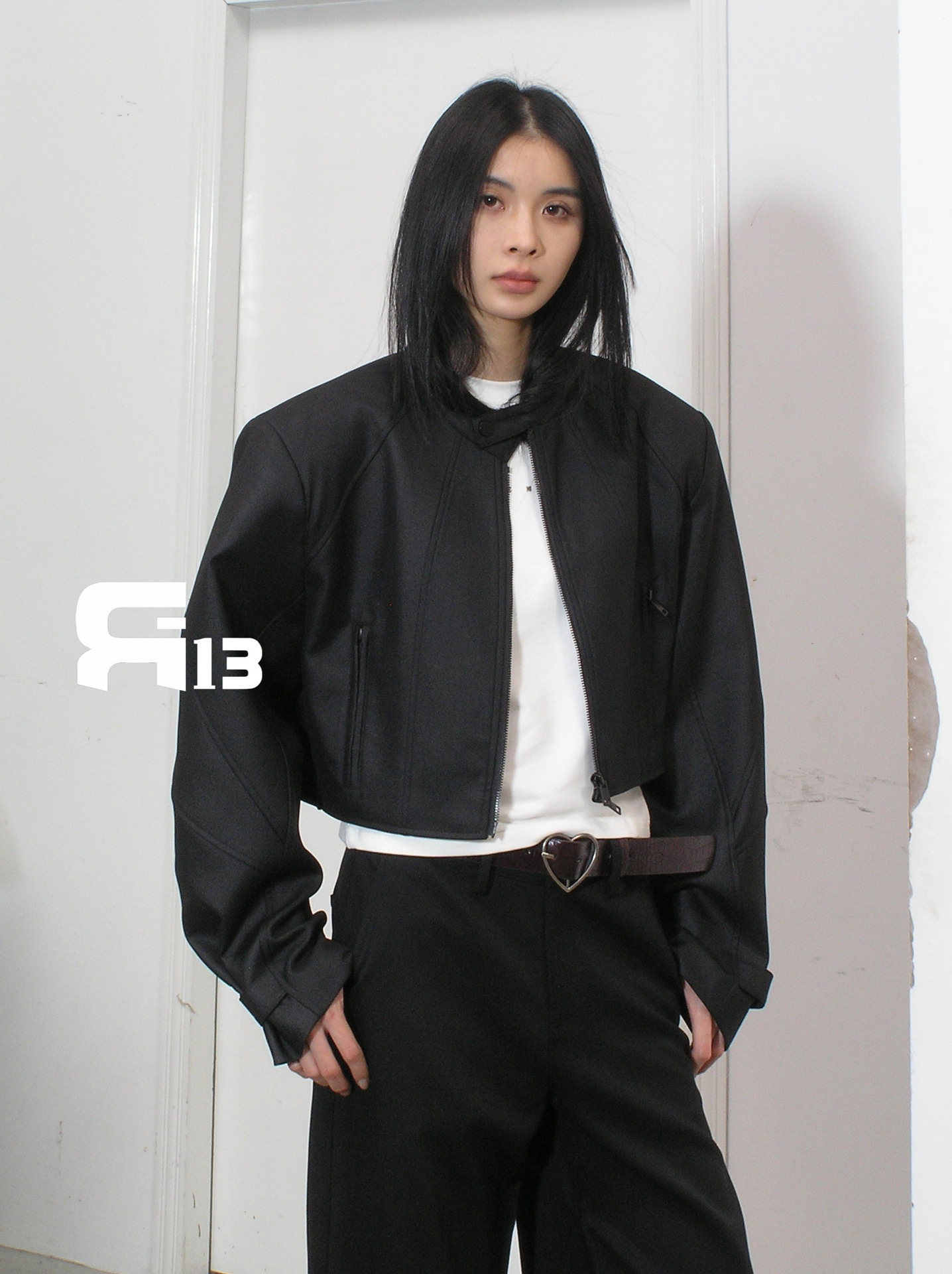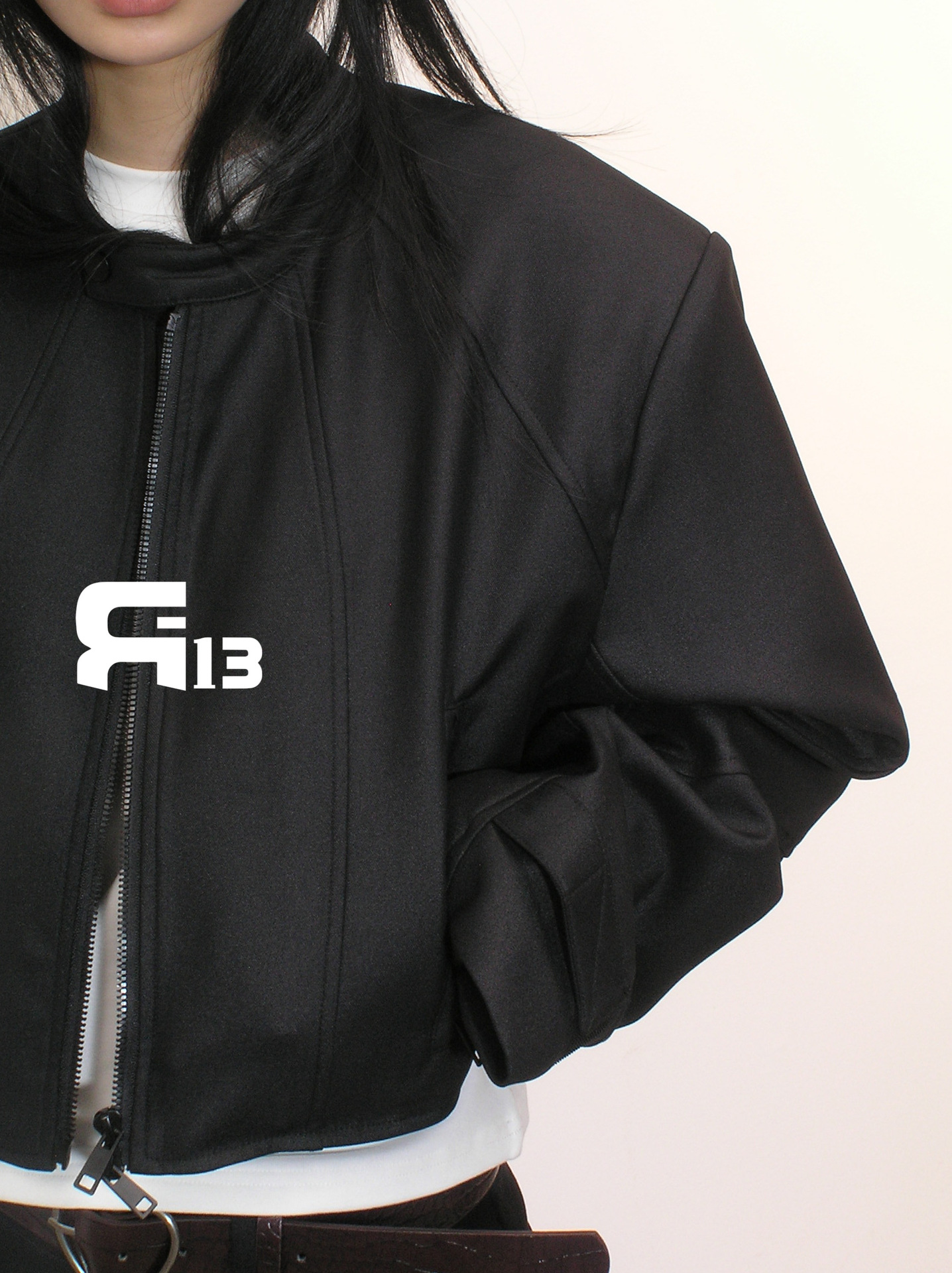 R13 Faux Leather Short Zipper Jacket Jacket Long Sleeve Cardigan Black / White